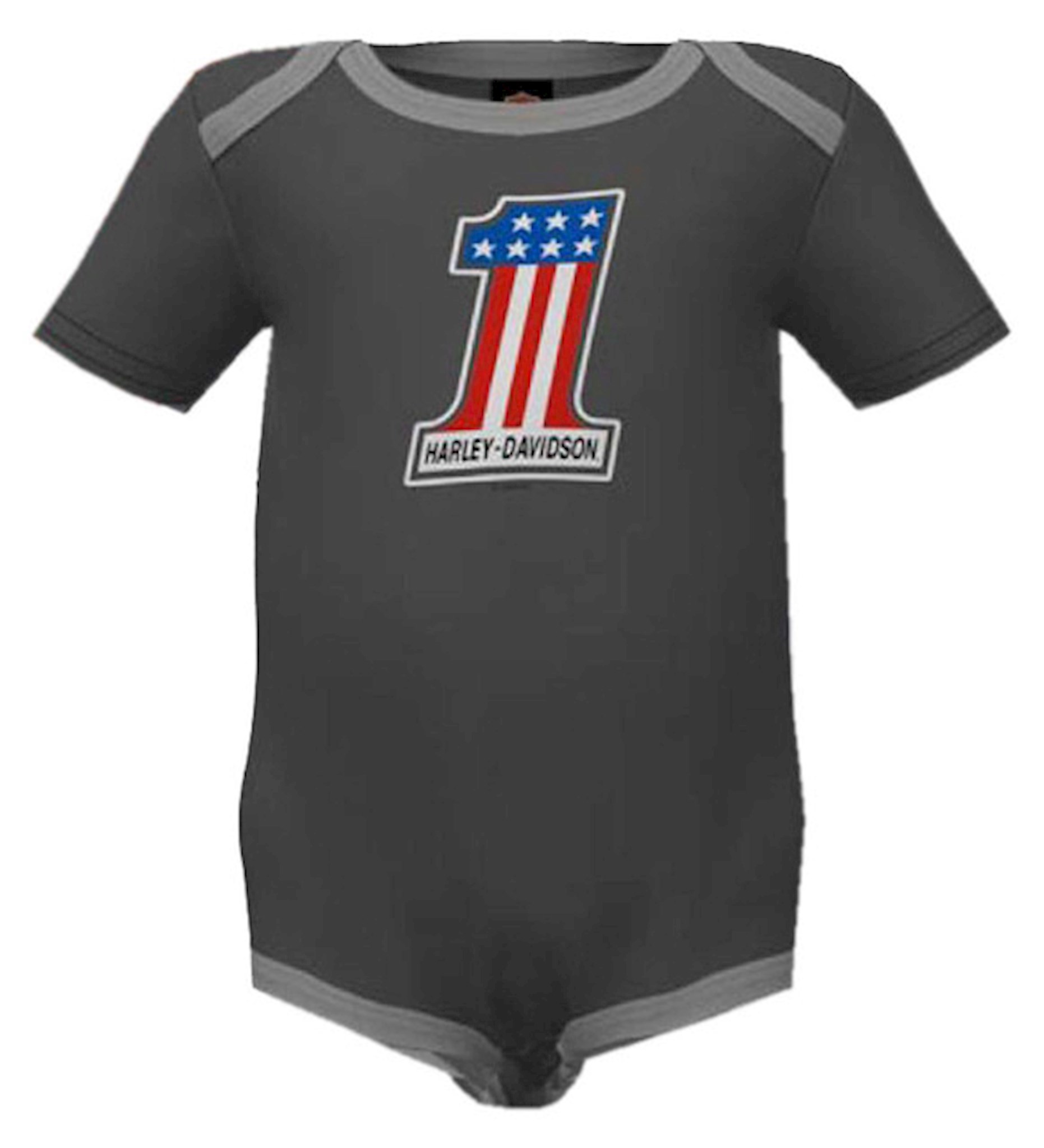 Harley-Davidson® Baby Boys' 2-Pack Colorblocked #1 Logo Rib Creeper Set, 3059237. Soft and comfortable, both are made from 60% cotton and 40% polyester. Iconic Bar & Shield logo and #1 RWB logo screen printed on each bodysuit. Three bottom snap closure. Each feature contrasting black or gray trim.