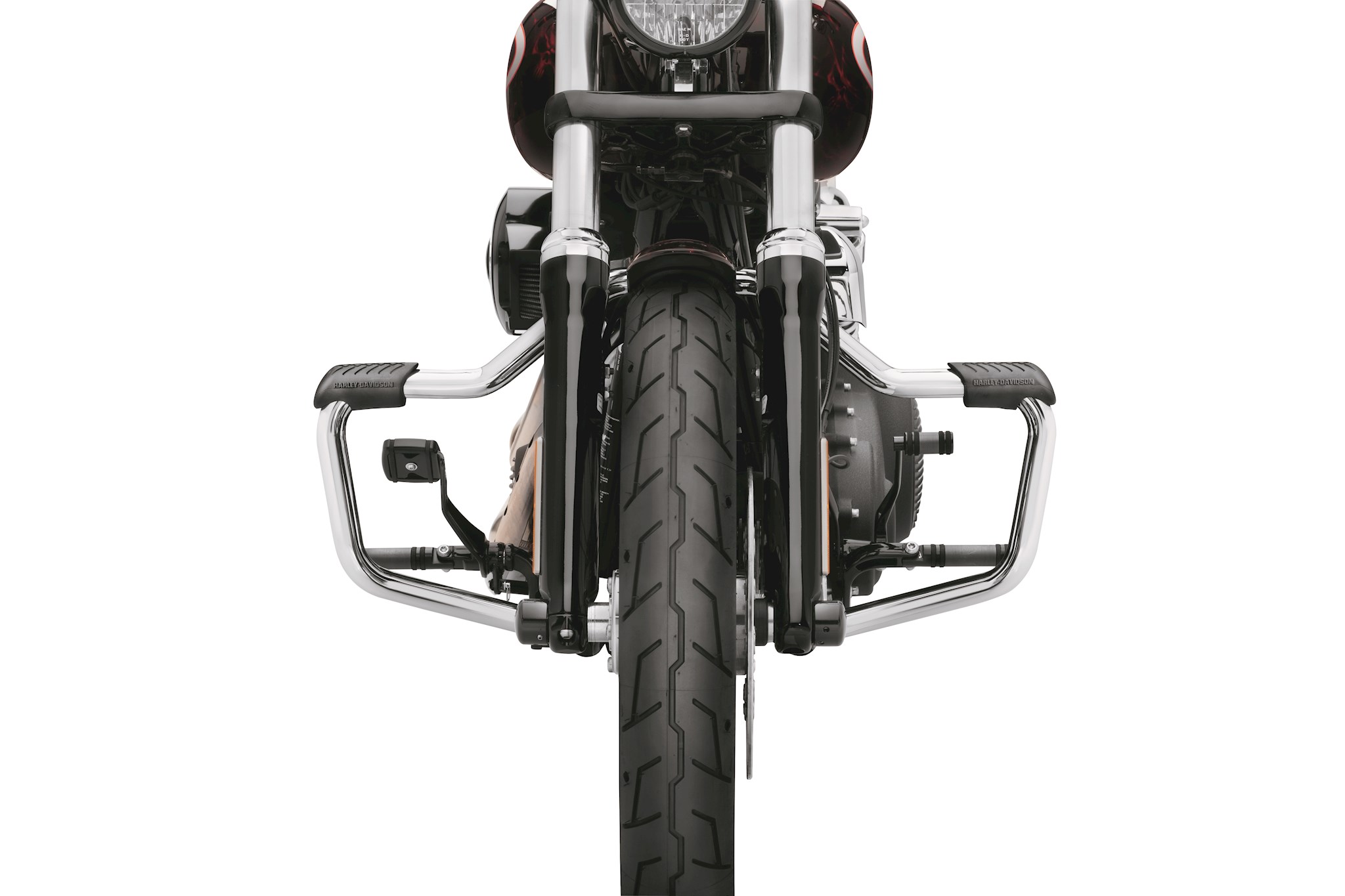 Combine classic shape and modern function for a unique twist on engine protection. The flow of this engine guard complements the bike's traditional style while the gracefully curved upper section incorporates highway pegs into the shape. The integrated rubber pads offer a comfortable and slip-resistant cushion for your feet while traveling the open road. One-piece engine guard kit includes all required mounting hardware. Fits '06-later Dyna® models. '14-later FXDL and all '15-later Dyna models in India require separate purchase of Horn Relocation Bracket P/N 69000058. Fits with Oil Cooler Kit P/N 26151-07. FXDSE/2 and FXDFSE/2 requires removal of front chin spoiler and separate purchase of Regulator Caddy P/N 70464-08A. '06-'11 models equipped with evap canister also require separate purchase of Canister Bracket P/N 47207-06. '12-later models equipped with evap canister require separate purchase of Canister Relocation Kit P/N 60800005.