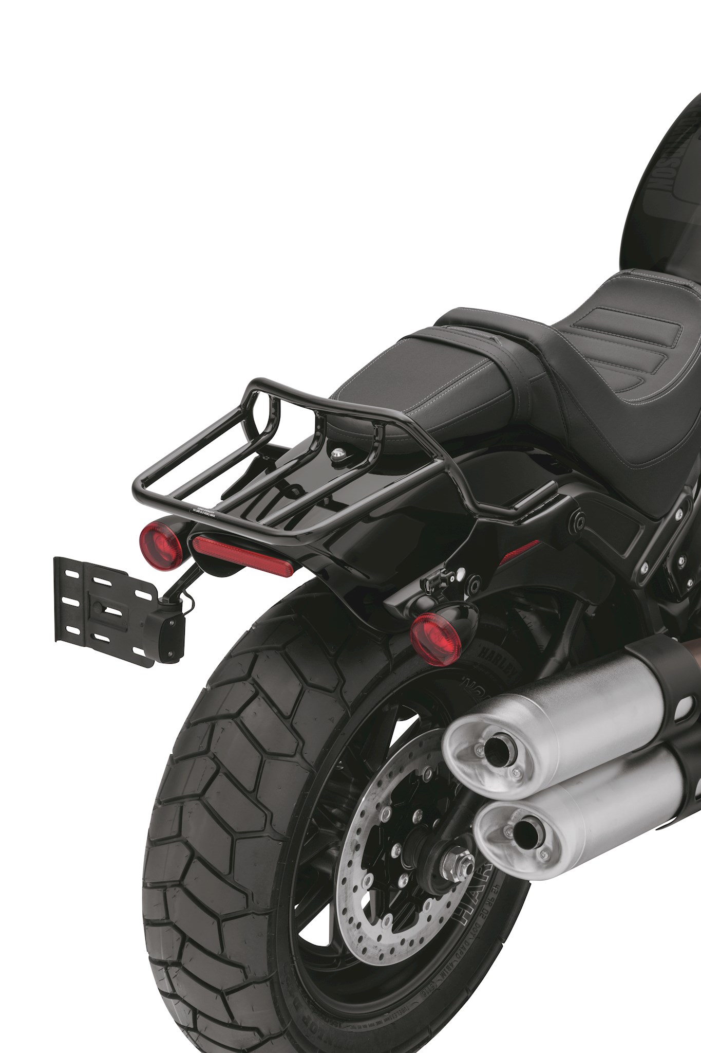 Low-profile styling defines the look of this Two-Up Luggage Rack. Designed to be installed without a sissy bar, this rack is ideal for carrying everything you need on your daily commute. These HoldFast Luggage Racks feature an exclusive latch system that permits the rack to be installed or removed in seconds, adding versatility to your ride. The HoldFast rack simply slips into position on the docking points, and the fingertip latches are clicked into position for a positive lock. Available in mirror chrome or rich gloss black finish, the leading edge of the rack features a flip design that keeps luggage from sliding forward, and provides a convenient tie-down attachment point. Fits '18-later FXFB and FXFBS models equipped with two-up seats. Installation requires separate purchase of model-specific Docking Hardware Kit.