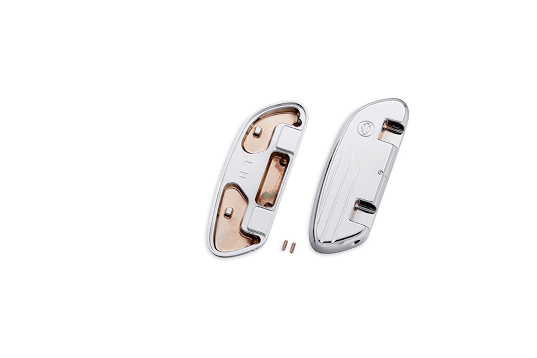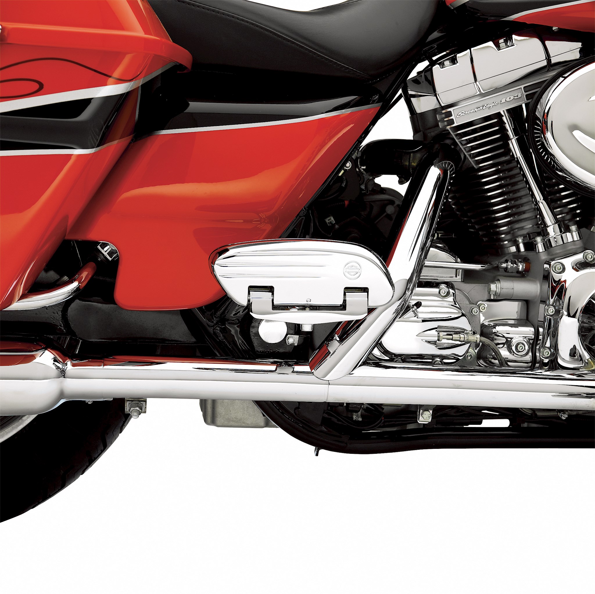 These unique Swept Wing Passenger Footboard pans complement the Swept Wing Rider Footboard shape and allow you to replace the Original Equipment passenger footpegs on certain models with footboards. When folded, the footboard displays a mirror-chrome surface in your choice of smooth or "ball-milled" grooved design. Footboard inserts and footboard supports sold separately. Fits '86-later Touring, '00-later Softail and '06-later Dyna models equipped with passenger footboard supports. Does not fit Trike models.