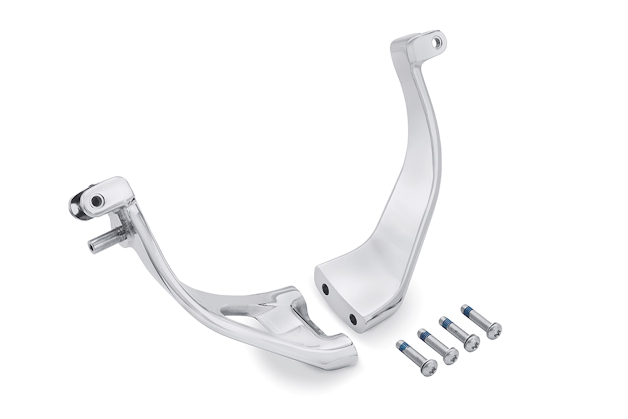 Add a touch of style by replacing the stock painted foot control brackets with brilliant chrome. Polished and plated for a custom look, this kit is manufactured with Original Equipment components for proper fit. Kit includes left and right supports and chrome mounting hardware.