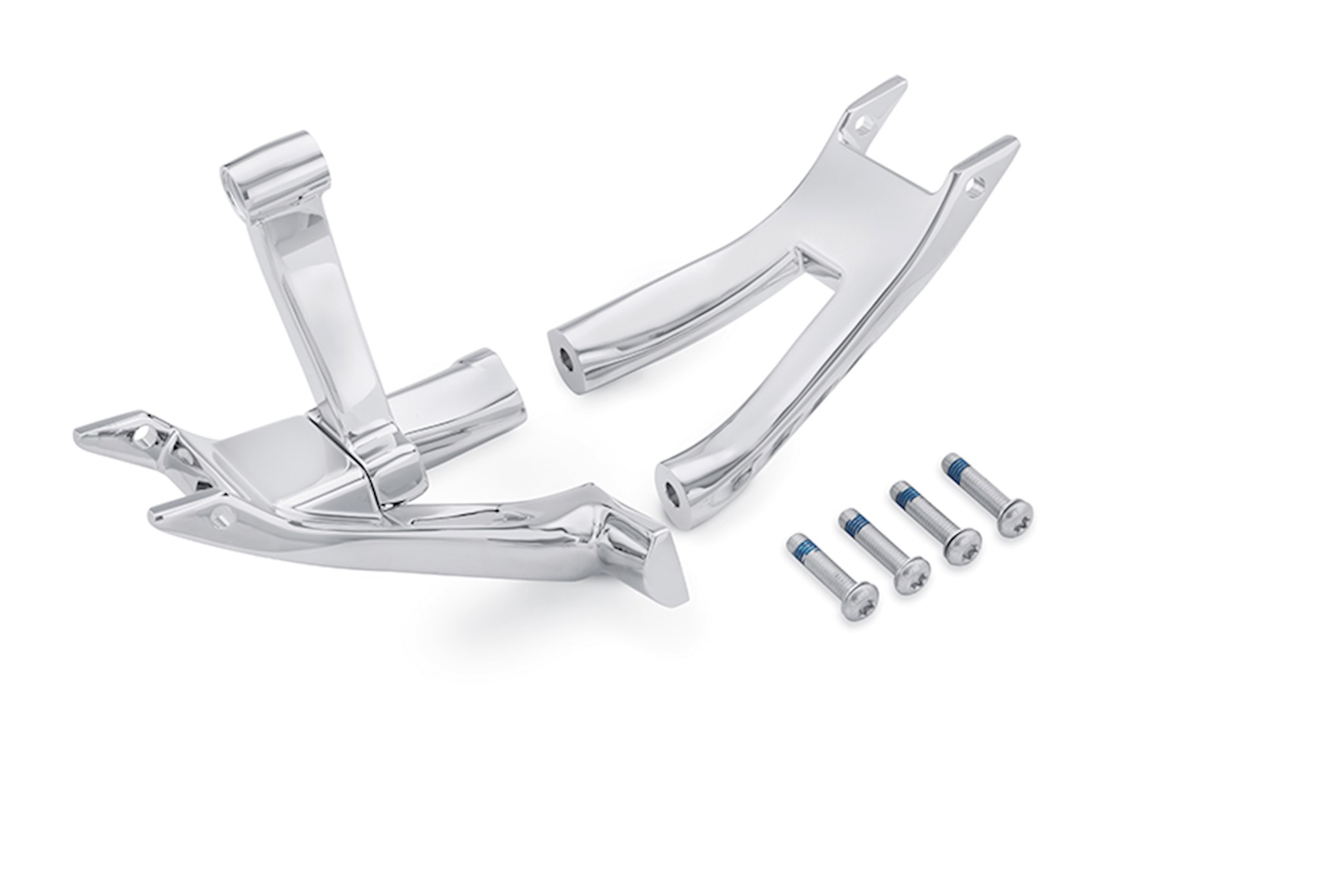 Complete the custom transformation by replacing the stock painted footboard brackets with brilliant chrome. The perfect complement to custom footboards, this kit is manufactured with Original Equipment components for proper fit, and are polished and plated to a brilliant finish. Kit includes chrome mounting hardware.