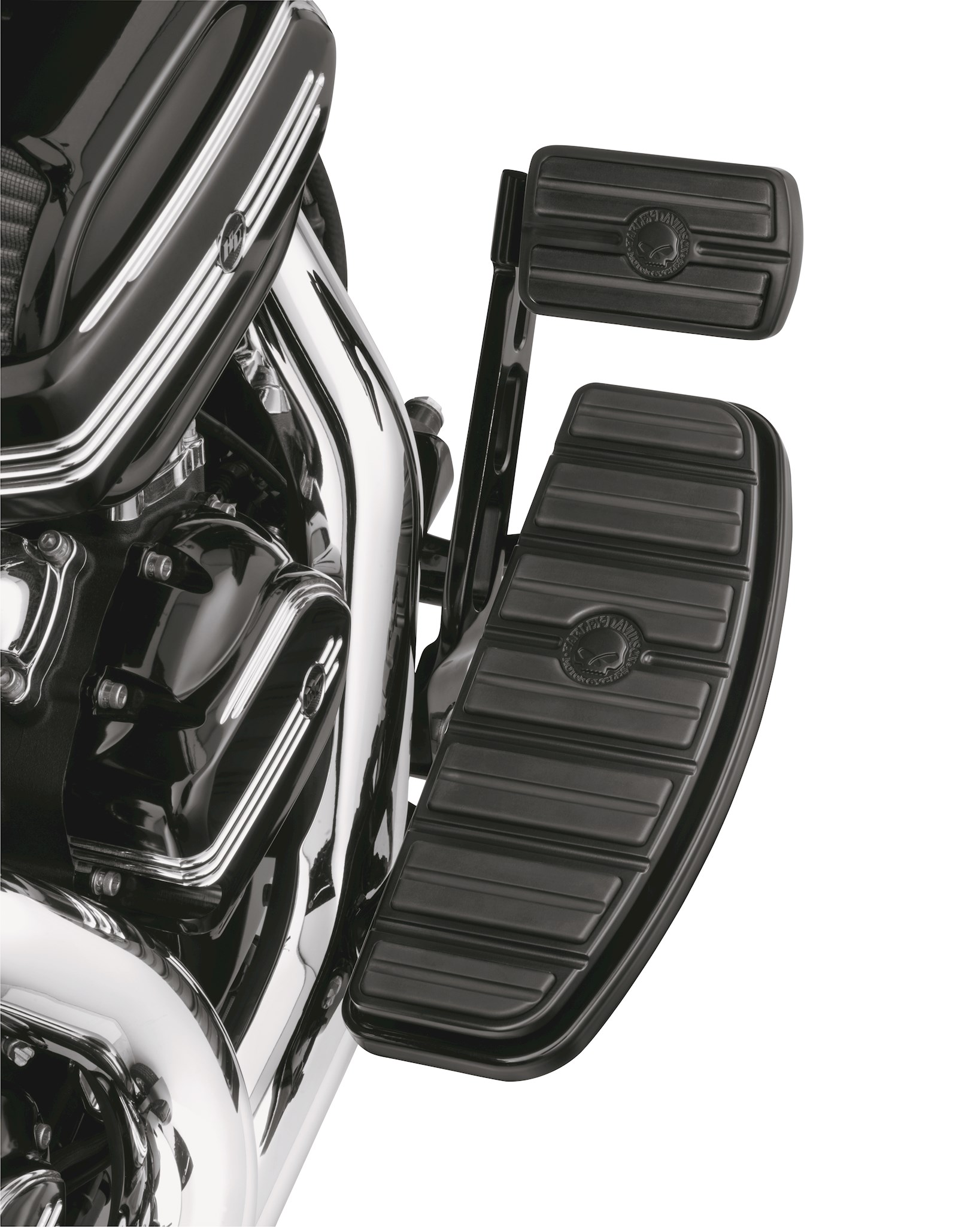 WILLIE G SKULL COLLECTION - BLACK As vast and infinite as your style, these Willie G Skull Collection Accessories are drenched in rich obsidian black and let you take the blacked-out look to a whole new level. The menacing dimensional skull and surrounding Harley-Davidson Motorcycles script add just the right touch of attitude to their clean, dark as night backdrops. Drenched in black and styled to match the Willie G Skull Collection Accessories, these footboard inserts retain the cast-in vibration isolation found on Original Equipment footboards. The over-molded rubber provides both comfort and traction while riding. Kit includes right and left insert.