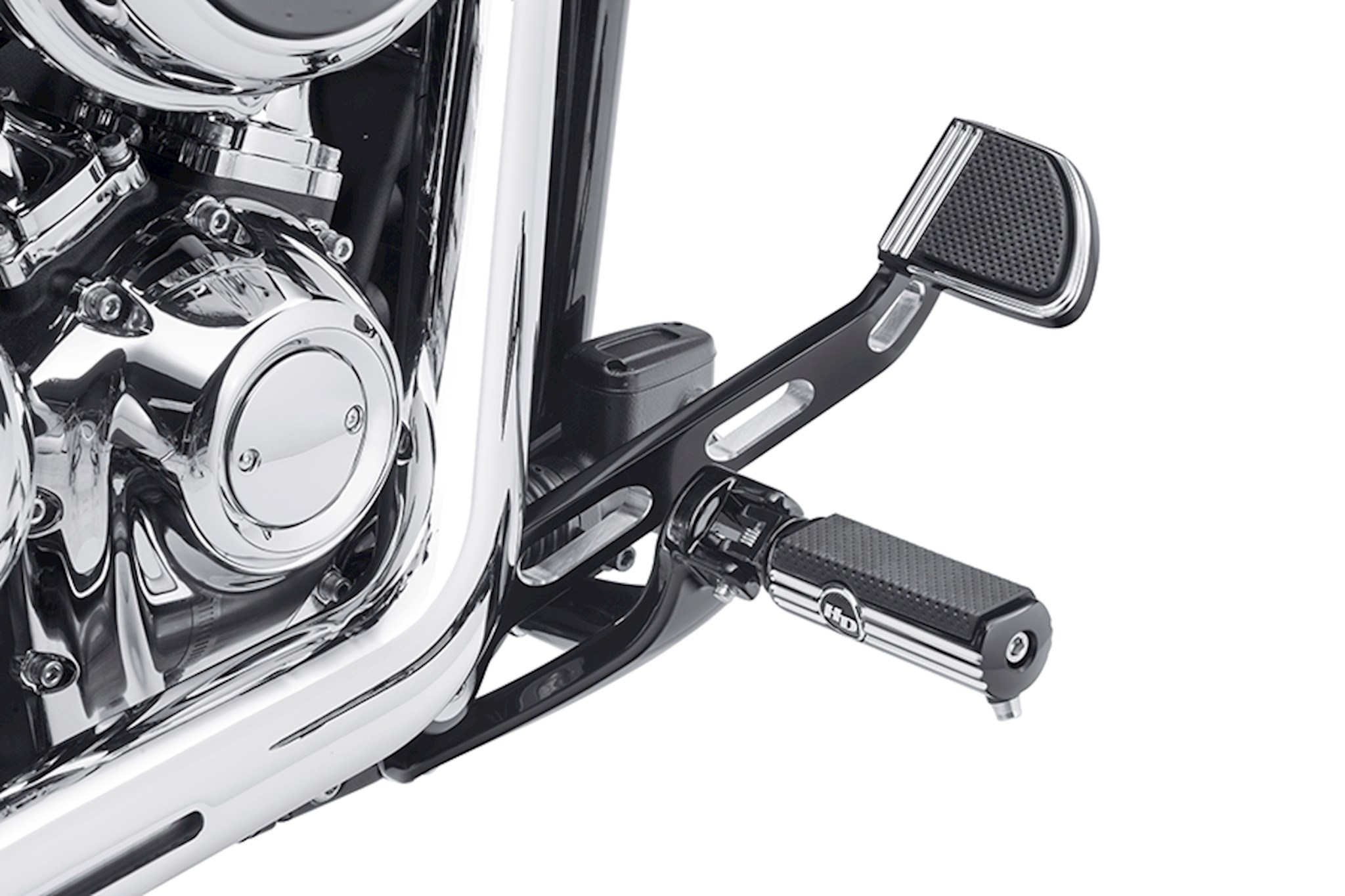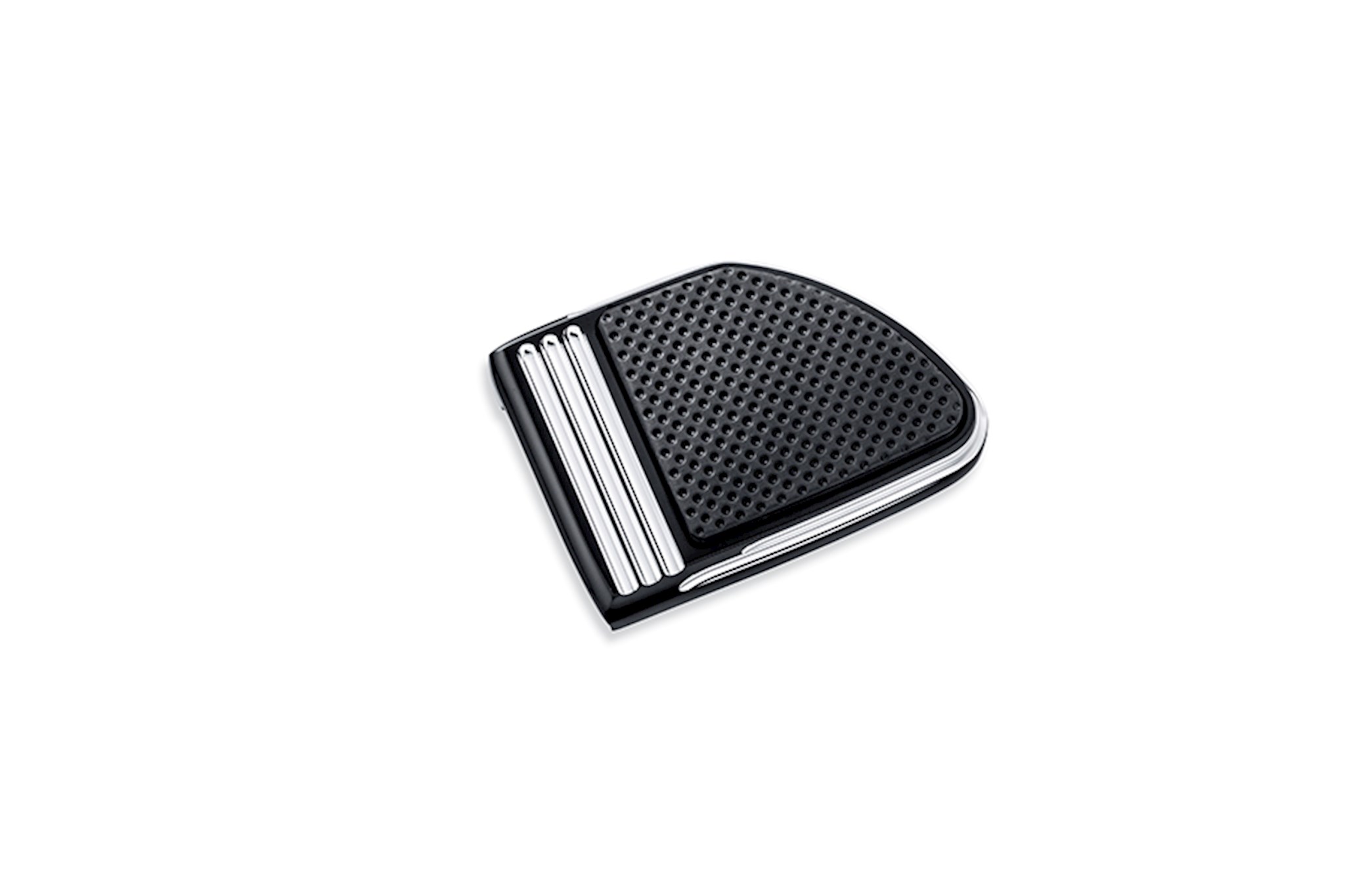 This stylish brake pedal pad features a rich black rubber panel set into the recessed surface, surrounded by deep accent grooves.