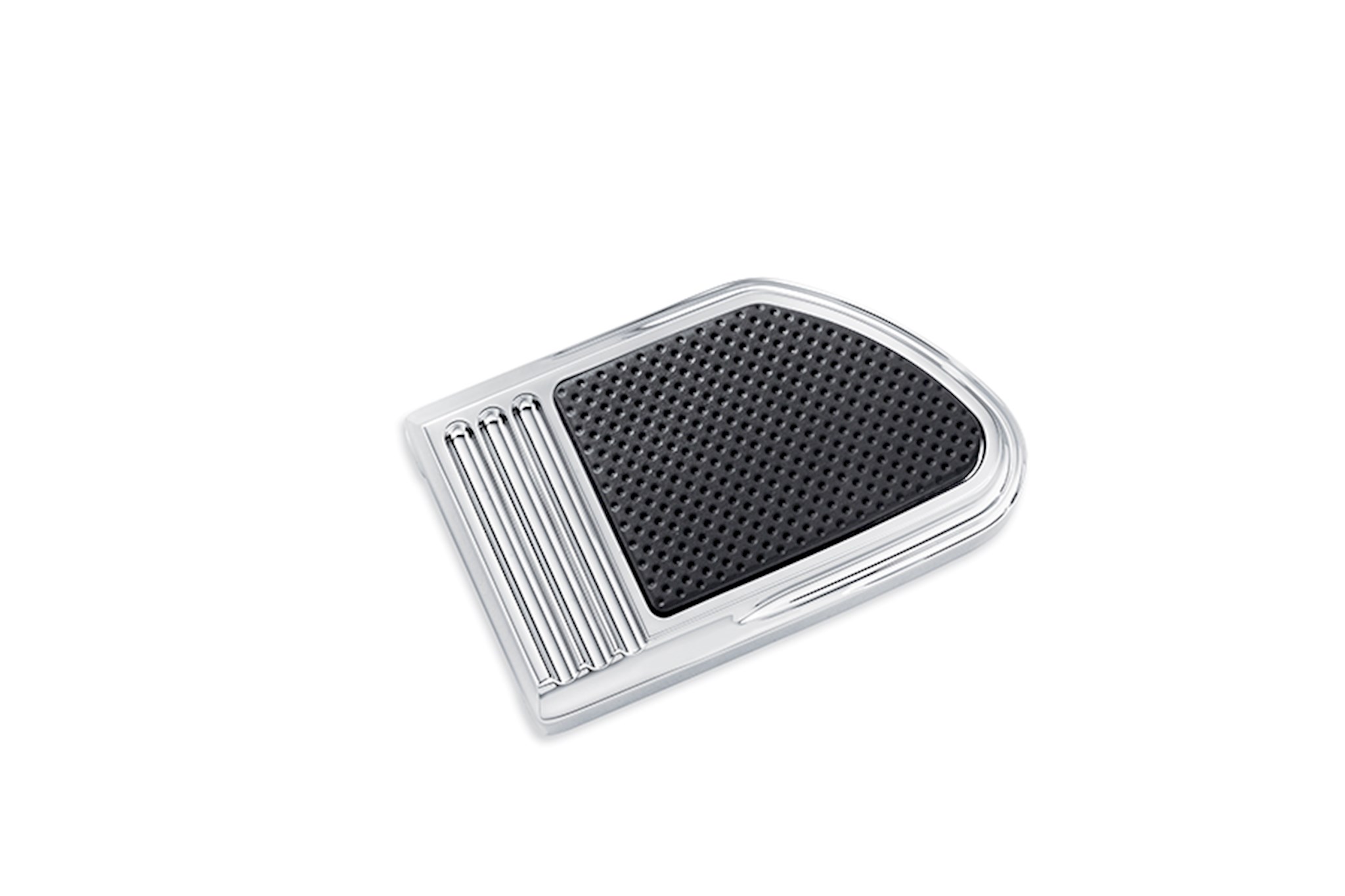 This stylish brake pedal pad features a rich black rubber panel set into the recessed surface, surrounded by deep accent grooves.