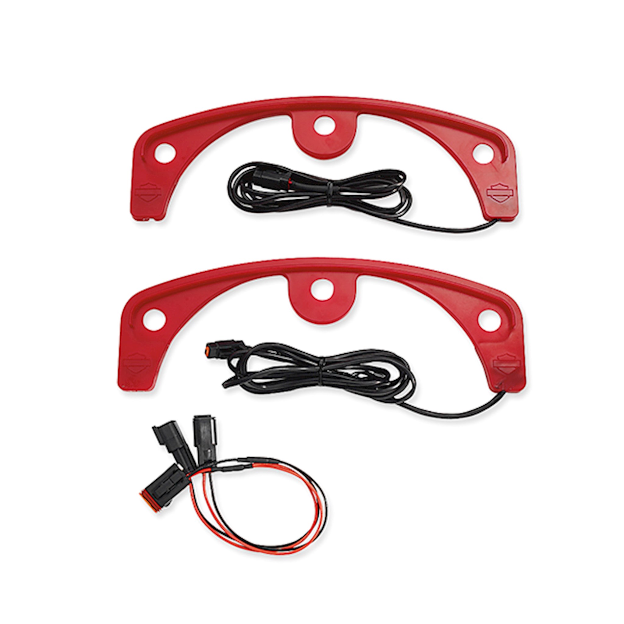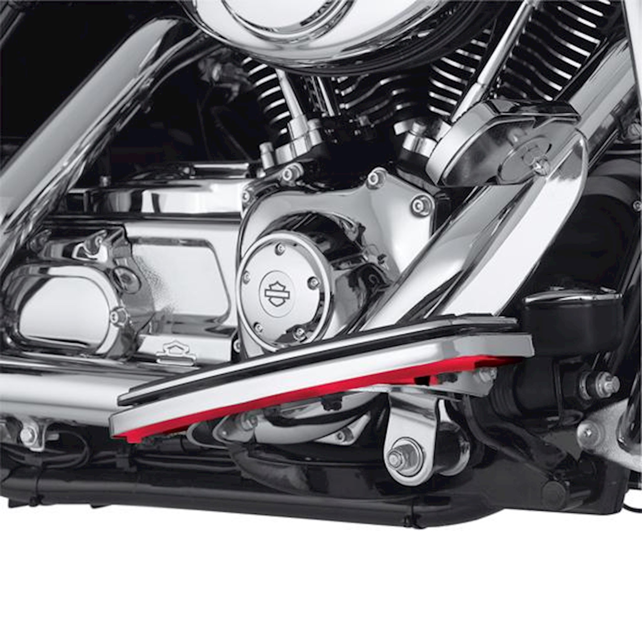 Add a rim of neon-like light to the rider footboard. This integrated red LED light and lens assembly hugs the bottom of the rider footboard and is held in place by the footboard insert isolation mounting system. The soft red glow acts as an auxiliary side marker light and casts a subtle pool of light to the ground below. The perfect complement to the Electra Glo Lighted Passenger Footboard Cover P/N 50541-03A. Kit includes left and right footboard lights, wiring harness and all necessary installation components.