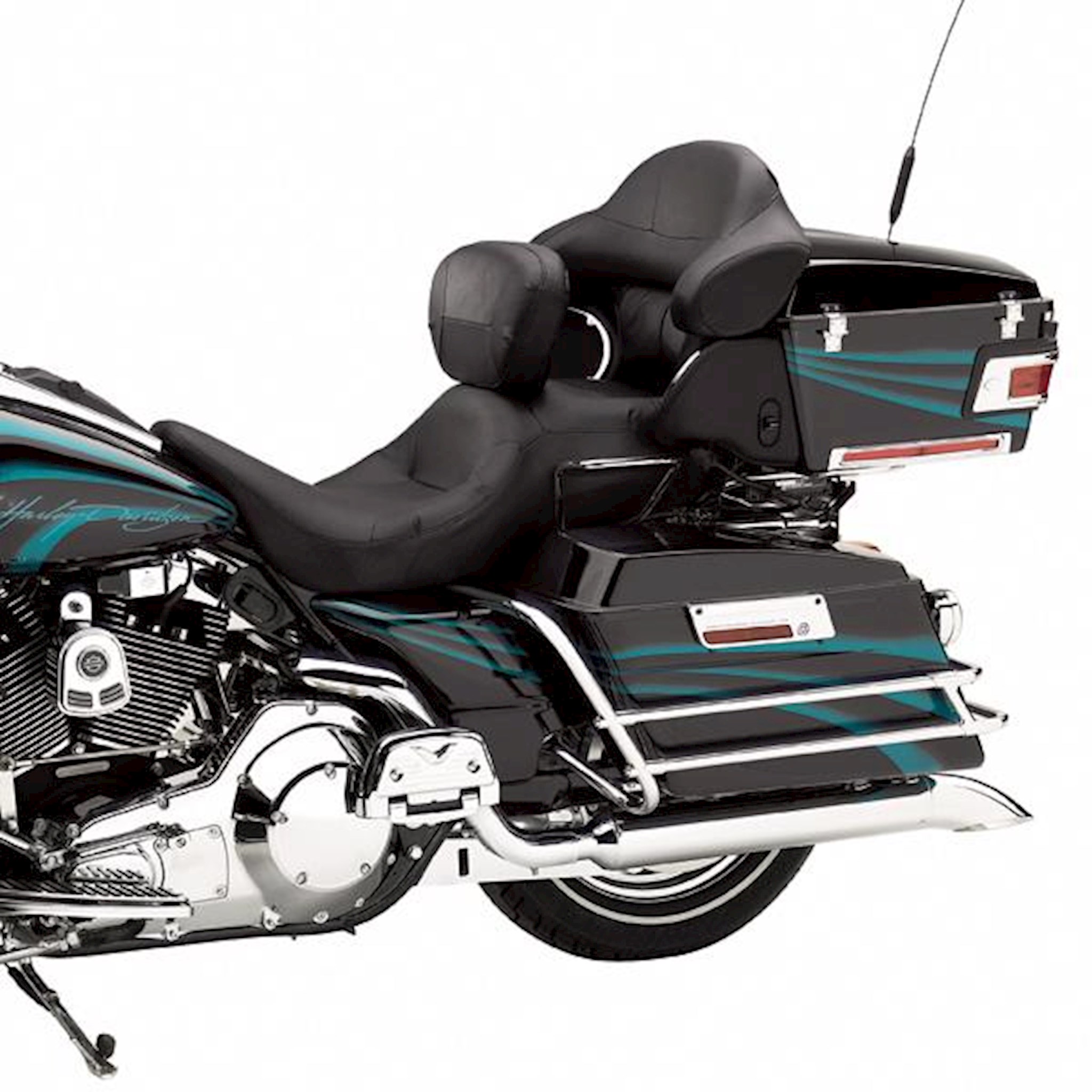 The deep bucket seat design and the smooth cover and stitching are the perfect complement to the Road King® style. The deep pocket provides additional back and thigh support for long distance comfort. Can be used with Rider Backrest Kits.