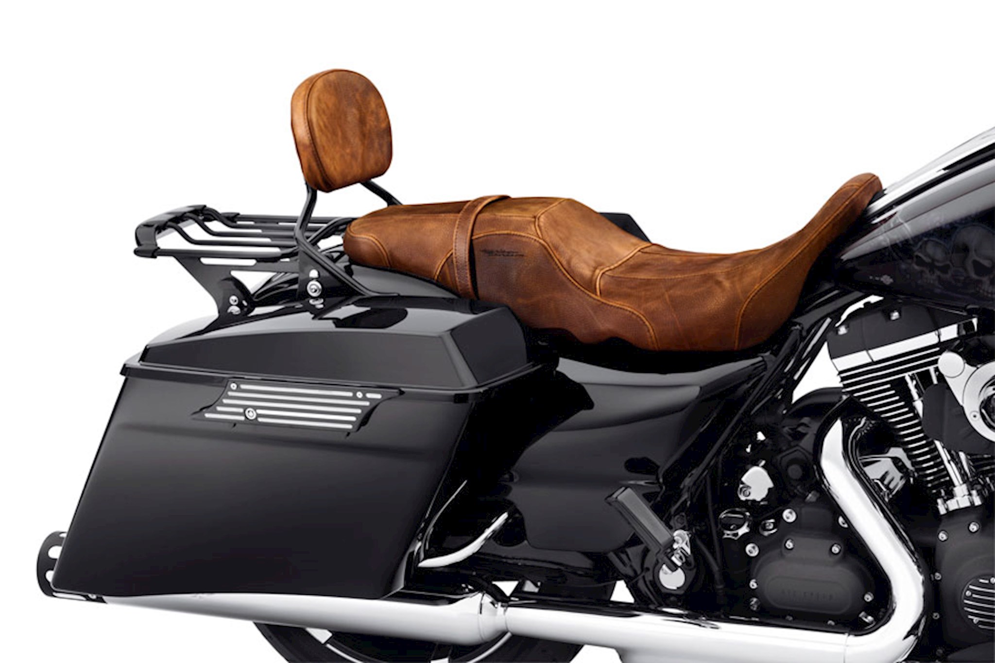 The timeless Badlander Seat, with its low and lean frame-hugging style, is dressed in rich brown leather that has the warm distressed feel of a well-worn bomber jacket. The individual leather panels are seamed together into a pattern that resembles a vintage western saddle, and the supple untreated surfaces will continue to age and develop character marks with every mile. Matching leather grab strap is included, and complementing Distressed Brown Leather Passenger Backrests are available for most models.