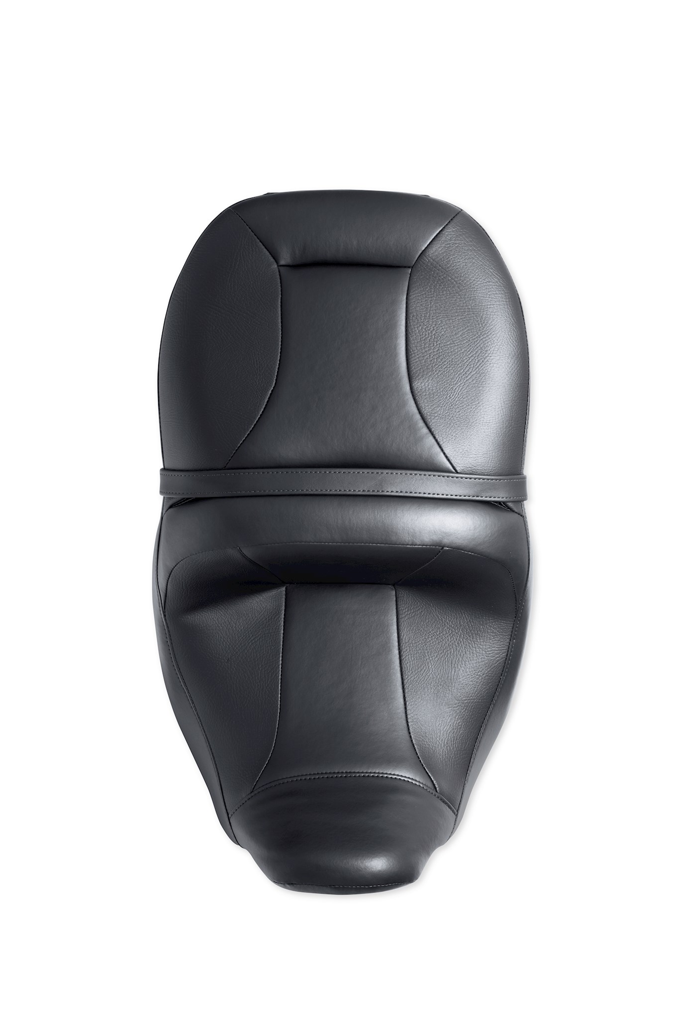 Stay in the saddle all day. The Harley Hammock Bucket Seat features an integrated suspension system that protects the rider and passenger's tailbone from harsh road impacts. Shaped like a cradle, the deep bucket seating surface holds the operator in position and provides plenty of lumbar support for the lower back. The underlying fabric sling isolates the rider from the seat base and minimizes sharp jolts from potholes and highway expansion joints. The generous long and wide passenger space features a spring-board suspension system for a 15% improvement in passenger comfort. Available with or without dual-zone heated rider and passenger seating areas, the seat's vinyl surface is easy to clean and maintain. Can be equipped with Rider Backrest (sold separately) on most models.