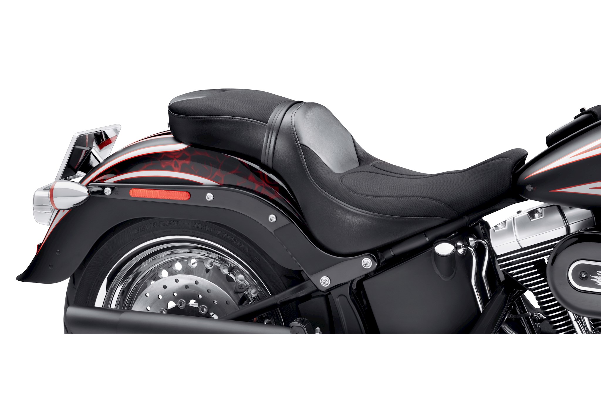 The mating of comfort and style. Low-profile Road Zeppelin® Seats are equipped with a unique adjustable air bladder system that distributes your weight across the seating surface. The air bladder system removes pressure points and provides shock absorption for the rider's and passenger's tailbone. You get hours of riding comfort, without sacrificing the low-slung custom look. The combination of smooth vinyl and waterproof textured fabric seating surfaces allows air to circulate beneath the body, reducing the air temperature between the rider and seat. The easy-to-reach integrated hand pumps and air release valves permit quick and convenient adjustment for both the rider and passenger.