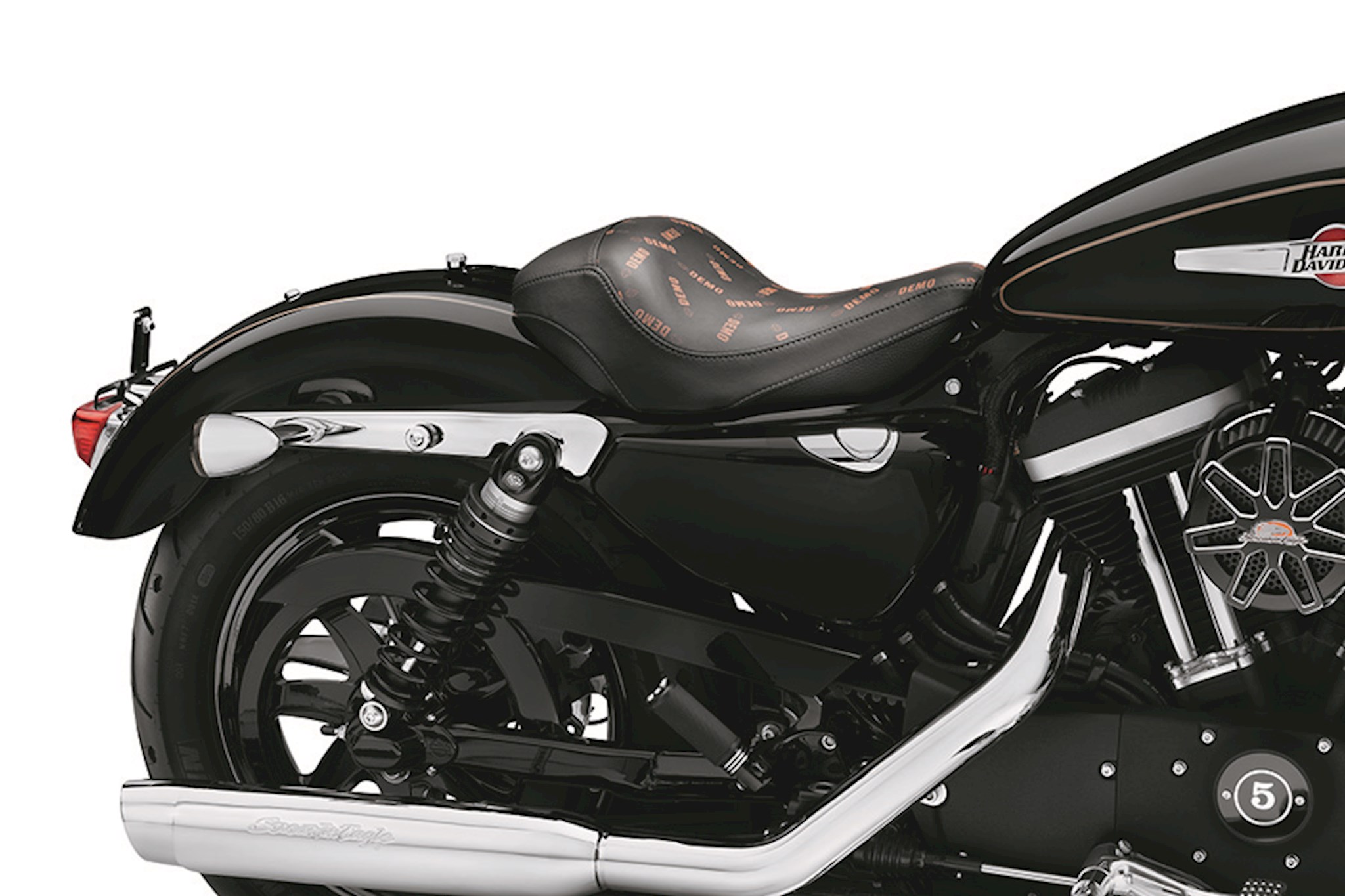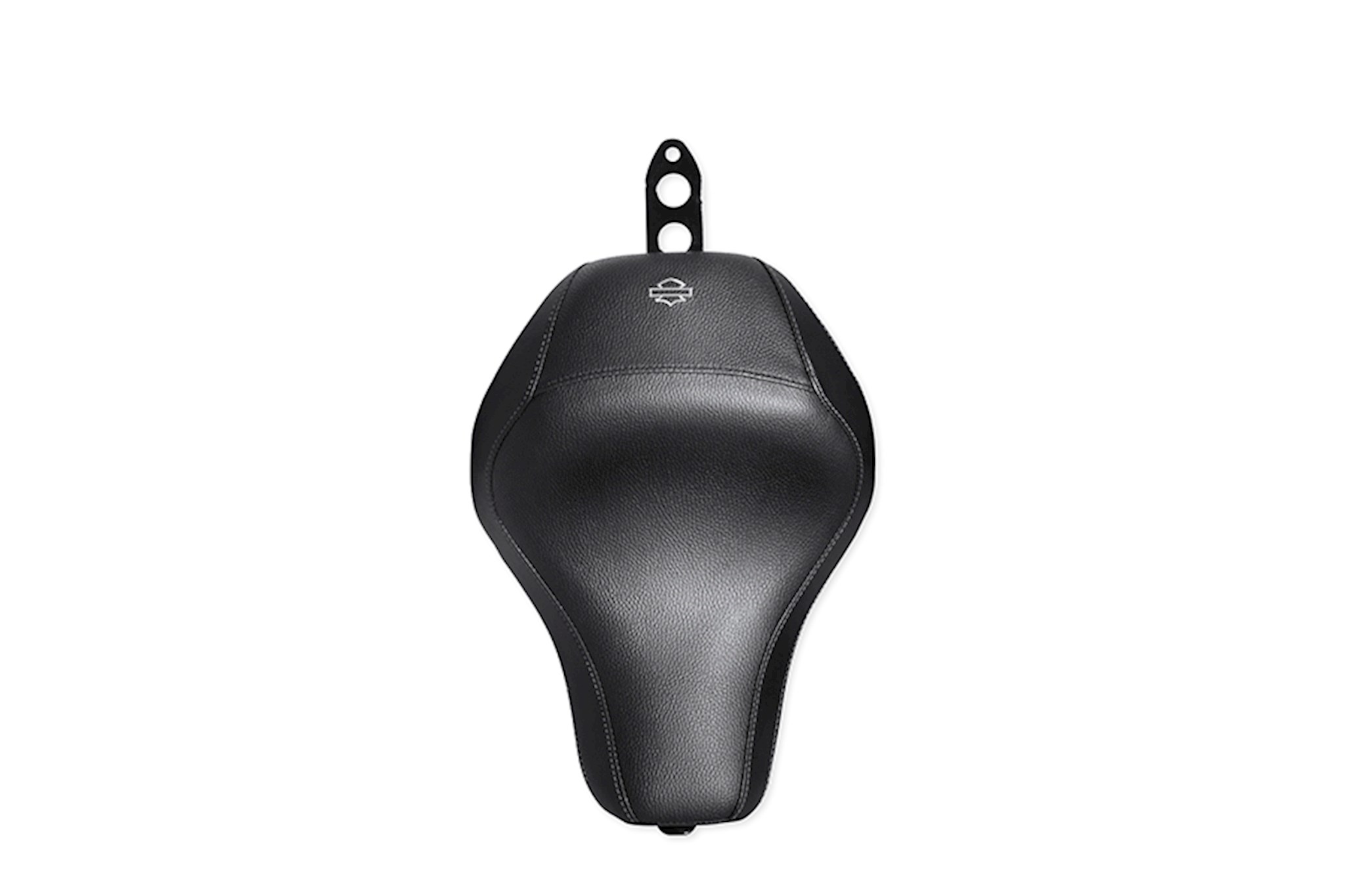 Get a little bit closer. Super Reach® forward position seats are designed to move riders with a shorter inseam even closer to the controls and to bring the legs closer together so that your feet rest firmly on the pavement. After hundreds of hours of on-road and ergonomic testing, the seat shape and foam density were selected as the ideal position for riders 5'-0" to 5'-4" tall. The Super Reach Seat moves the rider 1.5" closer to the controls compared to stock seat on XL883L model, and 2" closer and .5" lower compared to stock seat on XL1200C model. The nose is 1.0" narrower than the stock seat, and it is tastefully sculpted to look great with any size Sportster fuel tank. The combination of premium textured and smooth vinyl surfaces and charcoal gray stitching and embroidered Bar & Shield logo really set the seat apart. For the ultimate solo touring setup, add the Quick Release Rider Backrest P/N 52300245, and for a two-up ride, add the matching Passenger Pillion P/N 52400125.