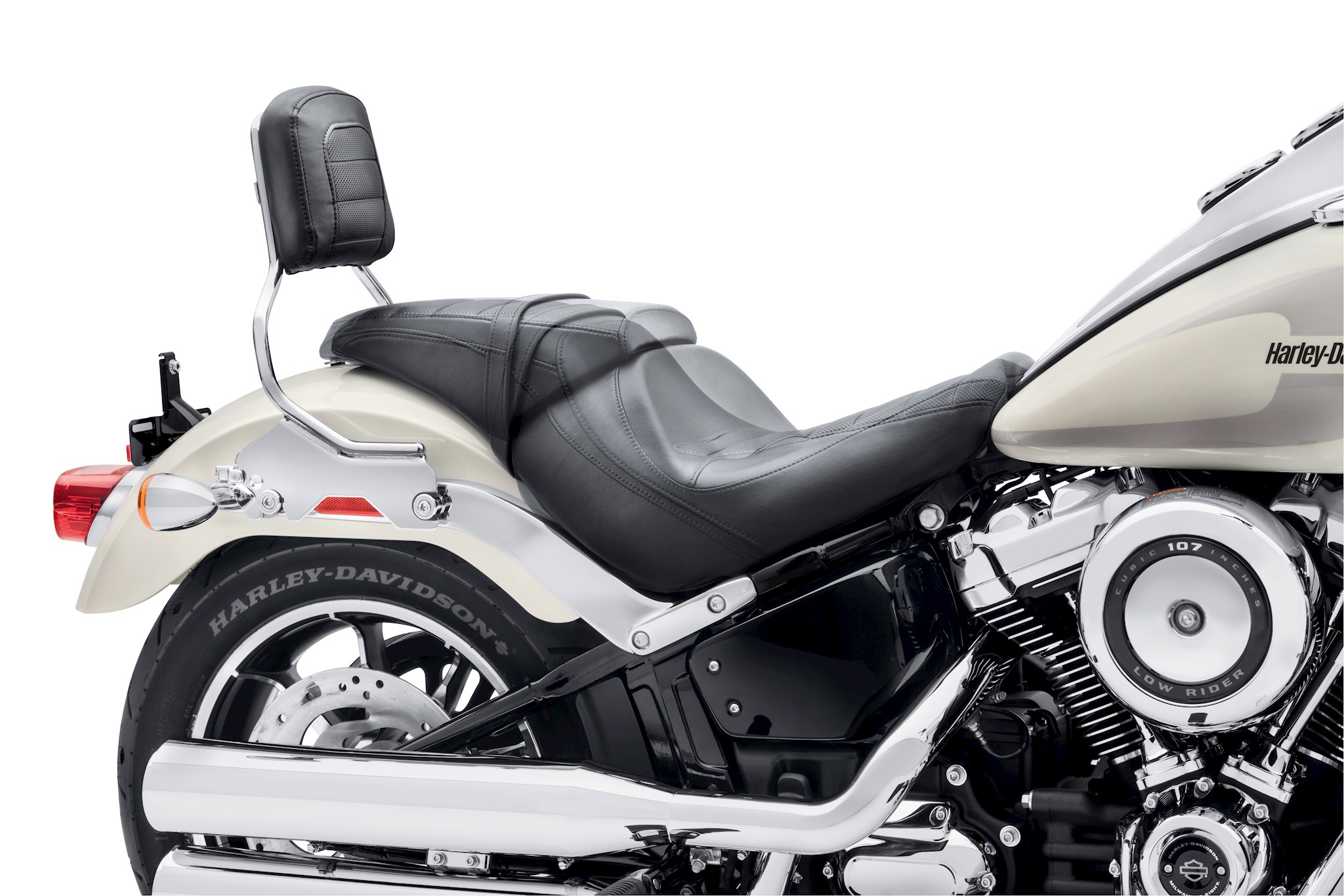 Designed to look like a separate solo seat and pillion, this smooth vinyl one-piece Reach Two-Up Seat perfectly complements the sweeping lines of the Low Rider model. - Stock '18 Low Rider model seat - 0.5" lower, 1.5" forward.