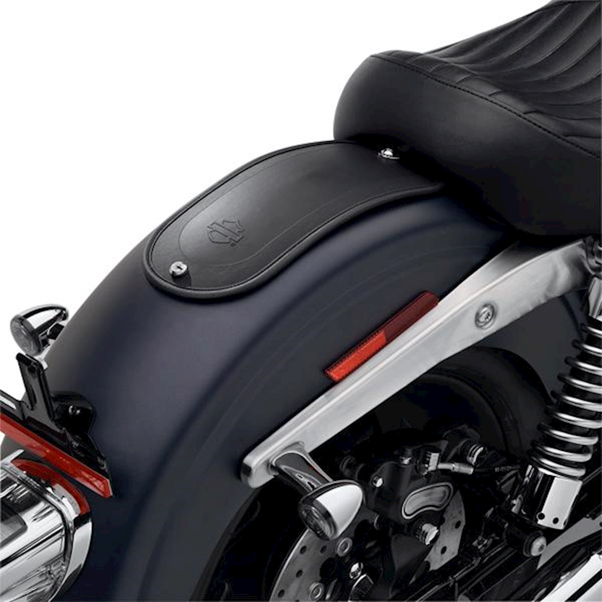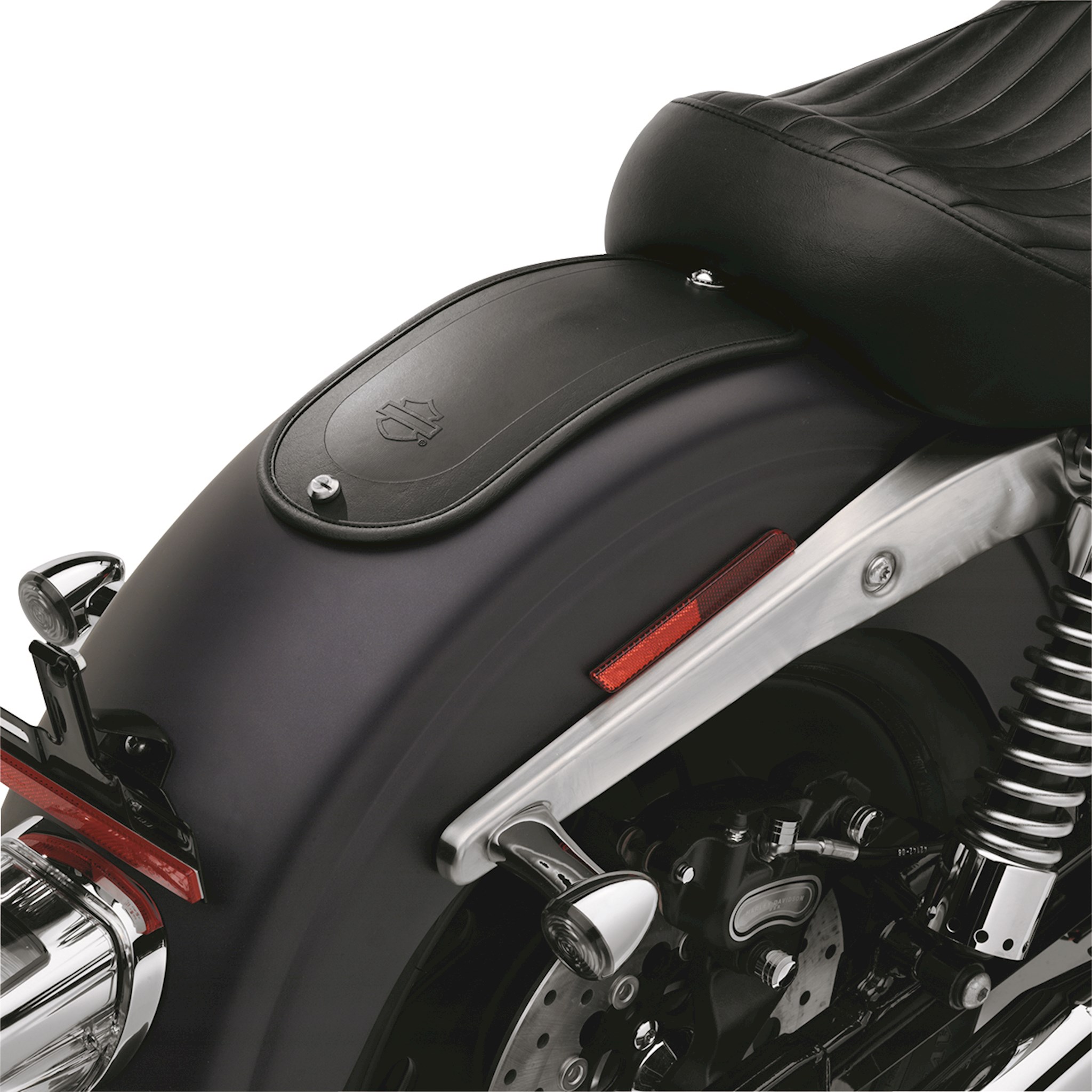 Go solo in style. Form-fitted to hug the contour of the rear fender, this decorative fender cover hides the seat mounting holes that are exposed when riding with a solo seat. Wrapped in smooth vinyl to match Original Equipment or accessory solo seats, the Fender Bib features an embossed Bar & Shield logo for added style. The molded base is finished with a soft felt under-liner designed to protect the fender's painted surface.