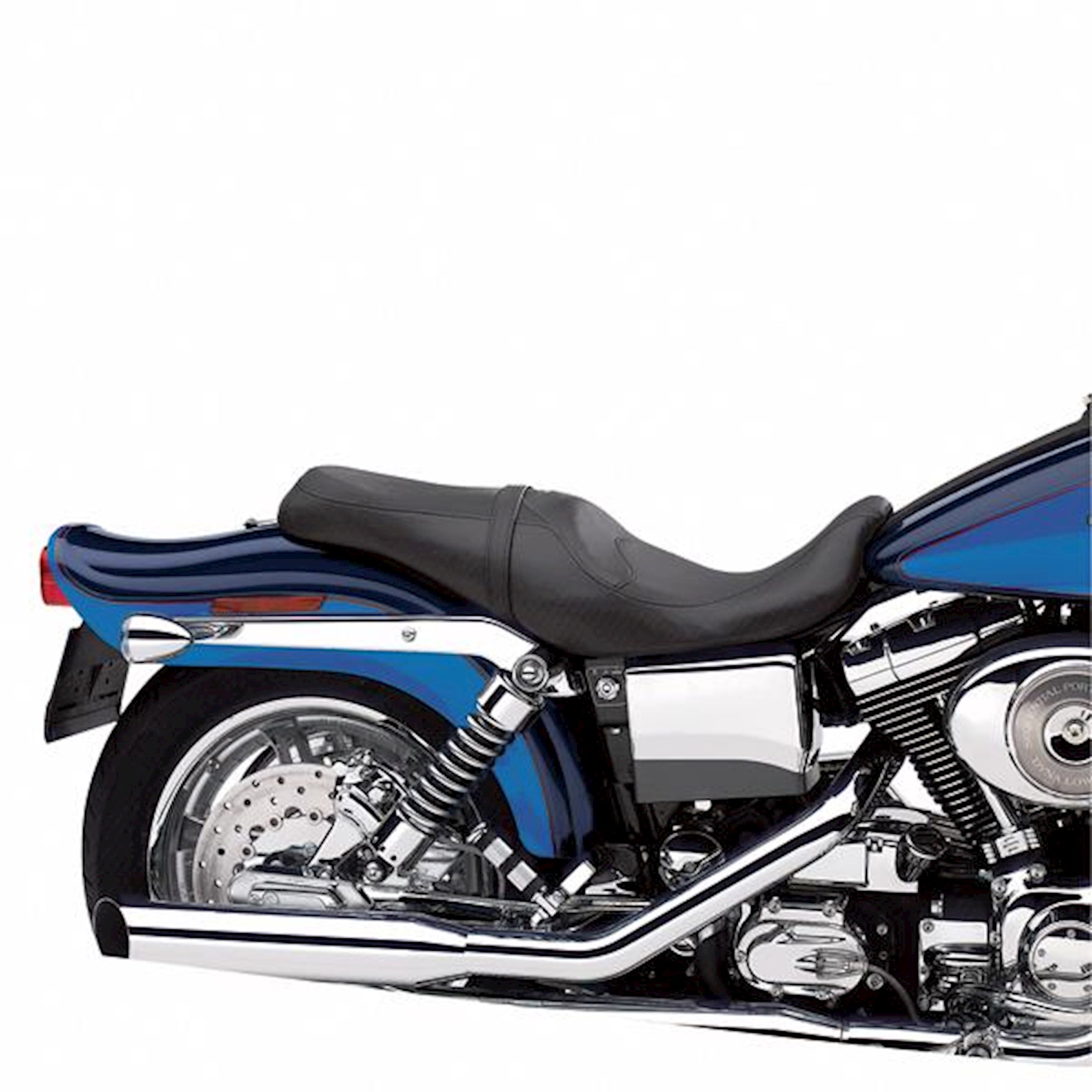 Designed specifically for riders requiring a close to the bar riding position, this seat positions the rider approximately 1.0" forward, closer to the hand and foot controls. The narrow front profile brings your legs closer together to help you plant your feet firmly on the ground. The seat features a textured vinyl insert and a "Harley-Davidson" logo that shows you are riding in style.