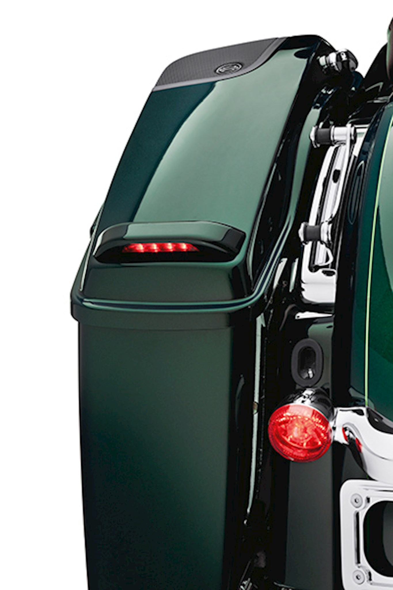 Custom fit to Tour-Pak Spoilers, these fast-acting LED Light Kits operate as a supplemental rear running light and brake light. The high mounting position places the light in the line-of-sight of following vehicles, and the bright, fast-acting red LED lamps get you noticed. Wiring is concealed for a clean, custom installation. Available with red or smoked lens. Fits '14-later Touring models equipped with Tour-Pak Spoiler Kit. FLHX, FLHXS, FLTRX and FLTRXS models will require separate purchace of Wiring Harness P/N 69201157.