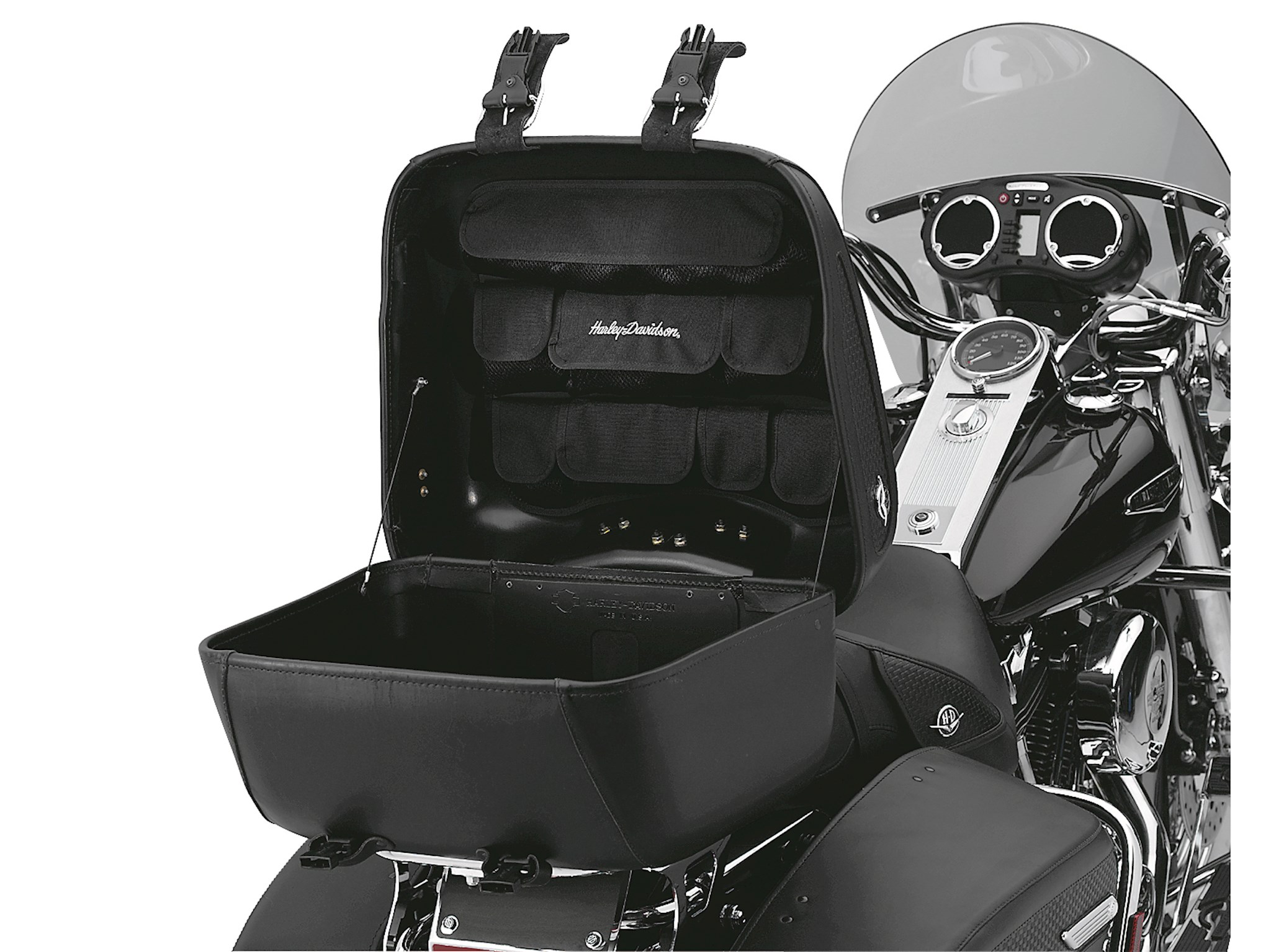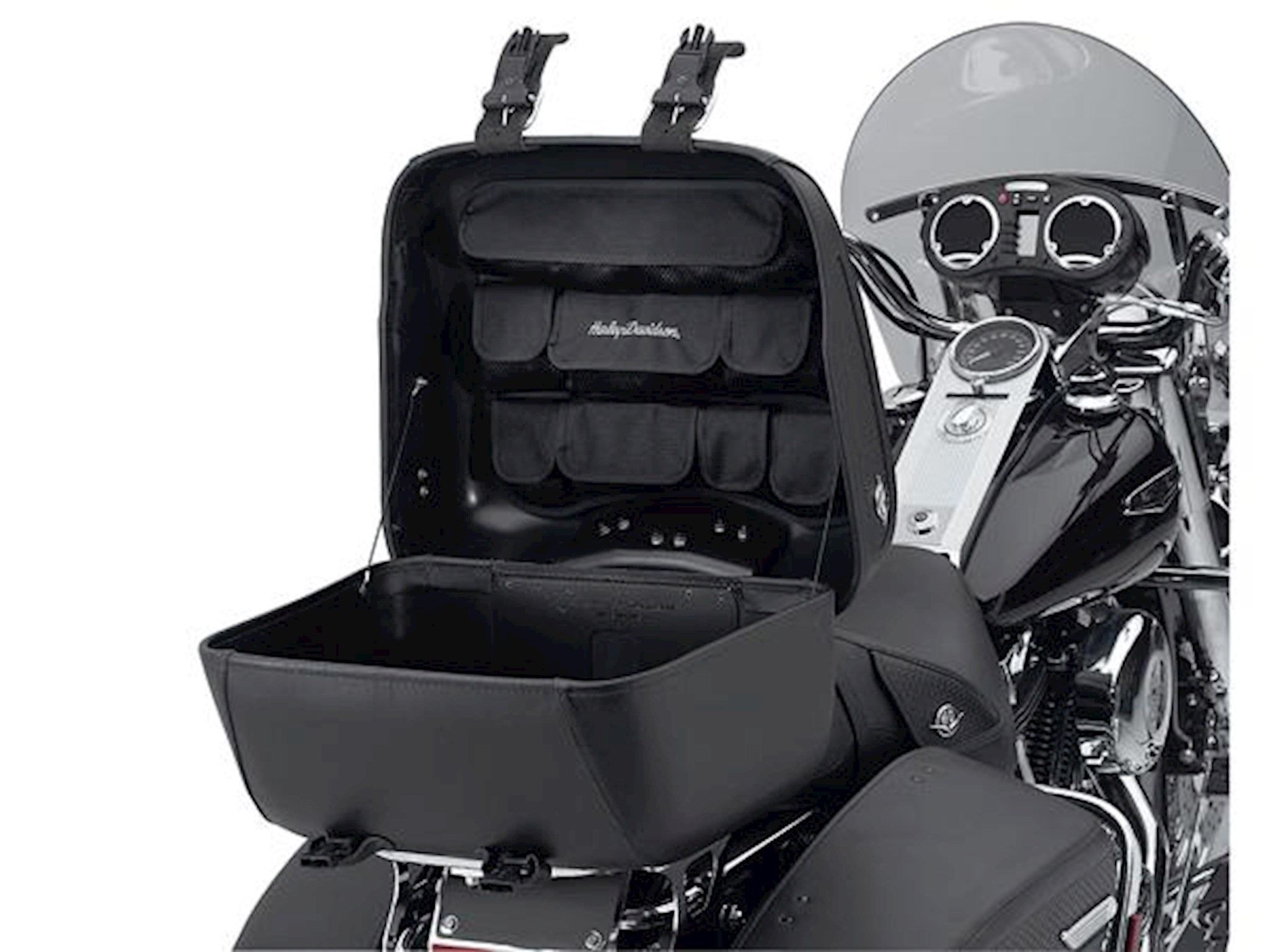 A true innovation in storage convenience and efficiency, this ingenious lid organizer helps keep smaller items conveniently located under your Tour-Pak lid for easy access. The organizer features five different-sized nylon-meshed pockets, as well as two flaps for additional storage. A great way to keep keys, cell phones, glasses, and papers handy.