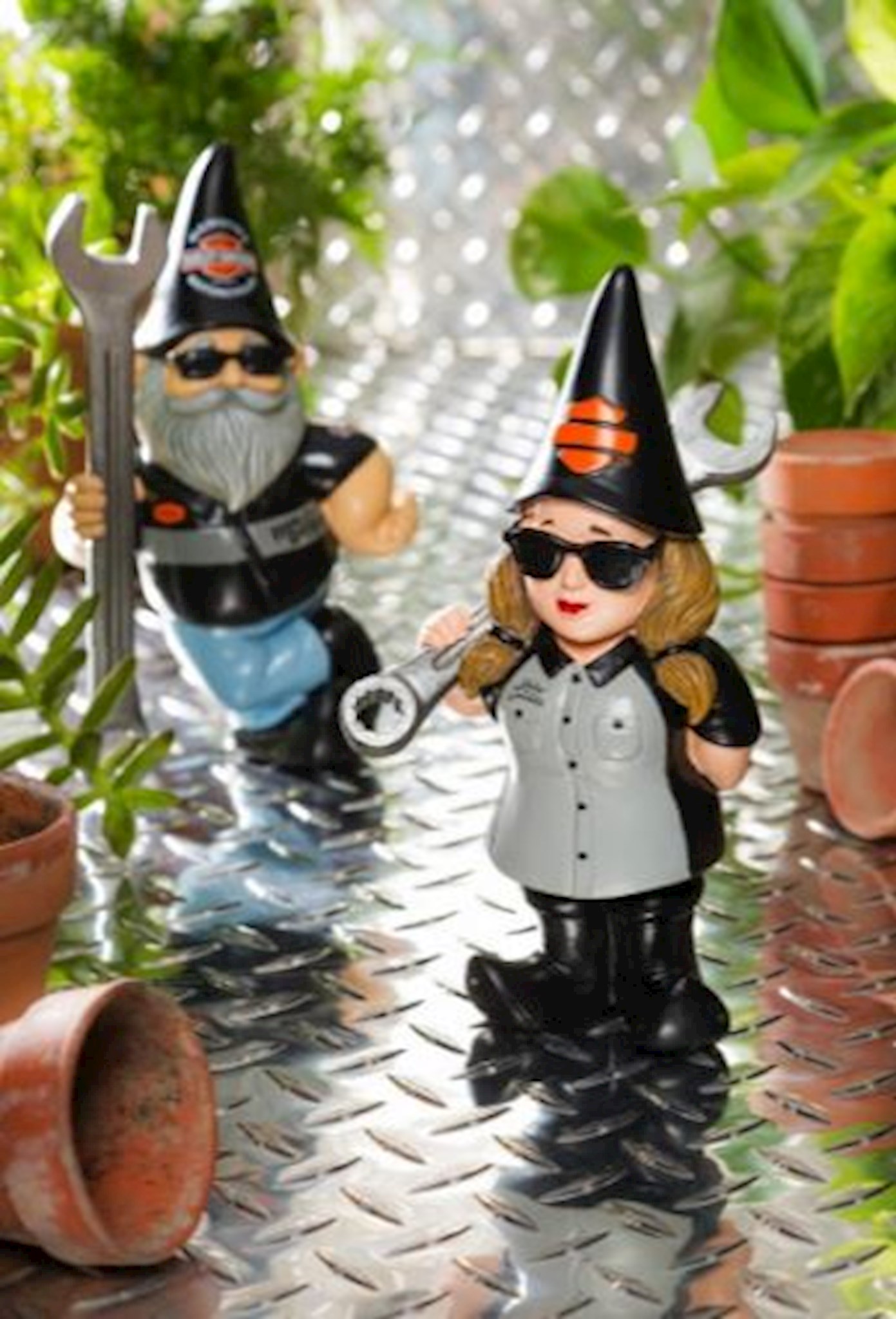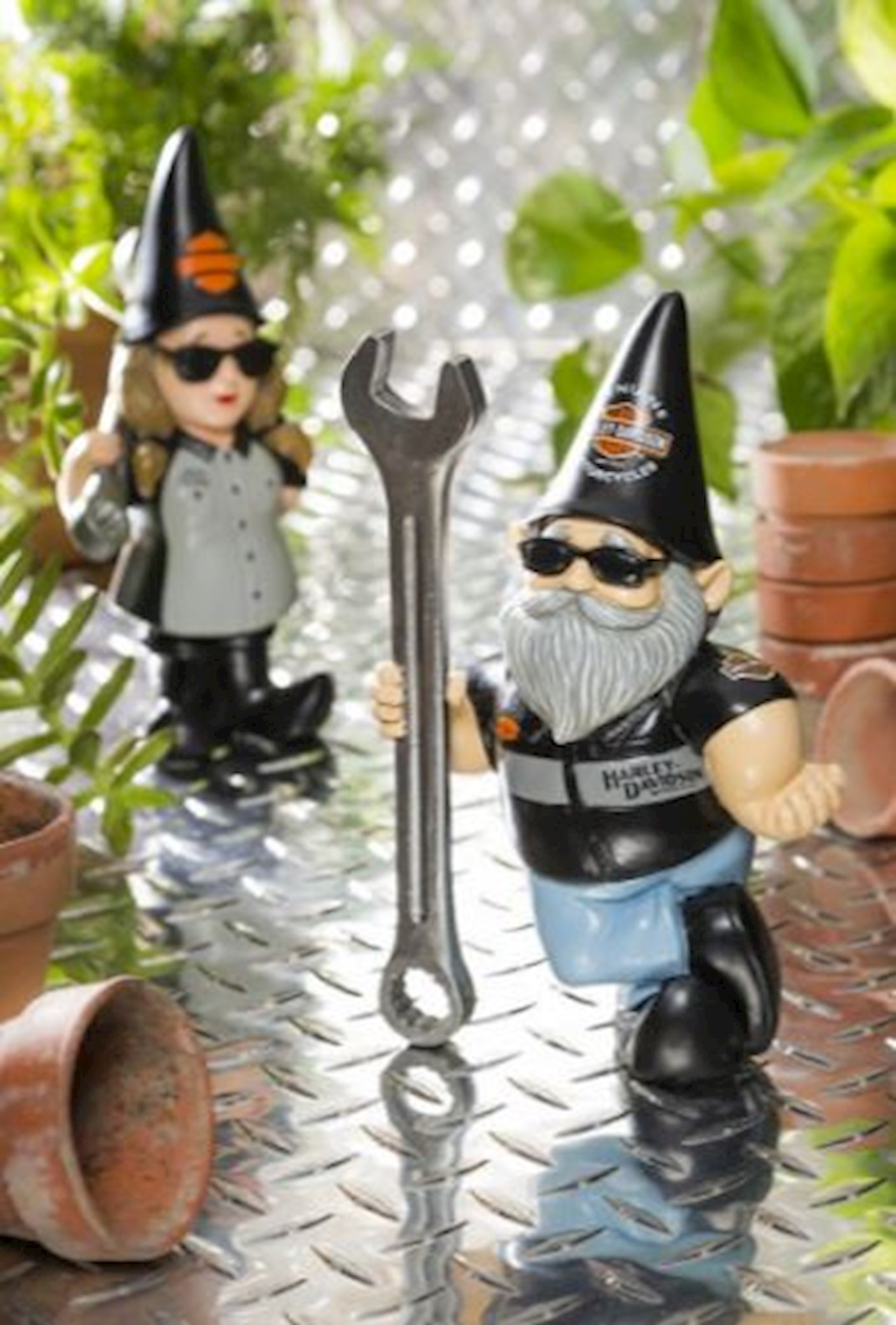 Harley-Davidson® Biker Themed Garden Gnome. First, a little history. Garden Gnomes were first created in 1840’s Germany. Within 10-years these statues spread all across Europe. They’re popularity spread because these Gnomes are believed to bring good luck to your garden. Even the most cynical among us might want to agree. These little fellows do have their charms. This gnome is made of durable and long lived Poly Stone™, which is UV, fire, chemical, and stain resistant. Now you can also bring good luck to your favorite rider with this biker themed gnome. He is decked out in his leathers and biker boots – he is ready to ride.