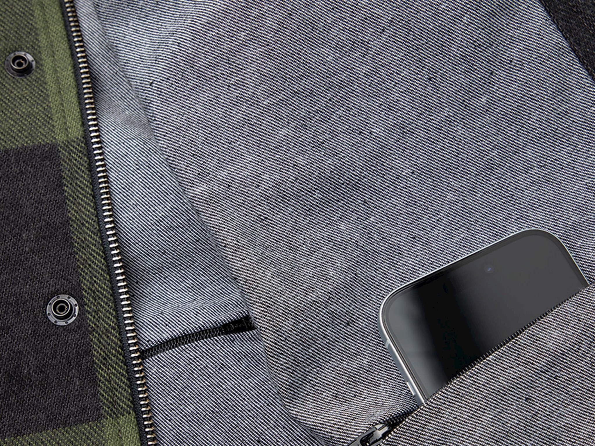 Klimaregulair en ademend dankzij Coolmax®. Windafstotend middel. Knoopkraag. Verborgen rits aan de voorkant met persnoppen. Twee borst- en zijzakken met persstuds. Twee binnenzakken met rits. Rits bij de mouwzoom voor breedteaanpassing. Ventilatieopeningen met rits onder de arm.