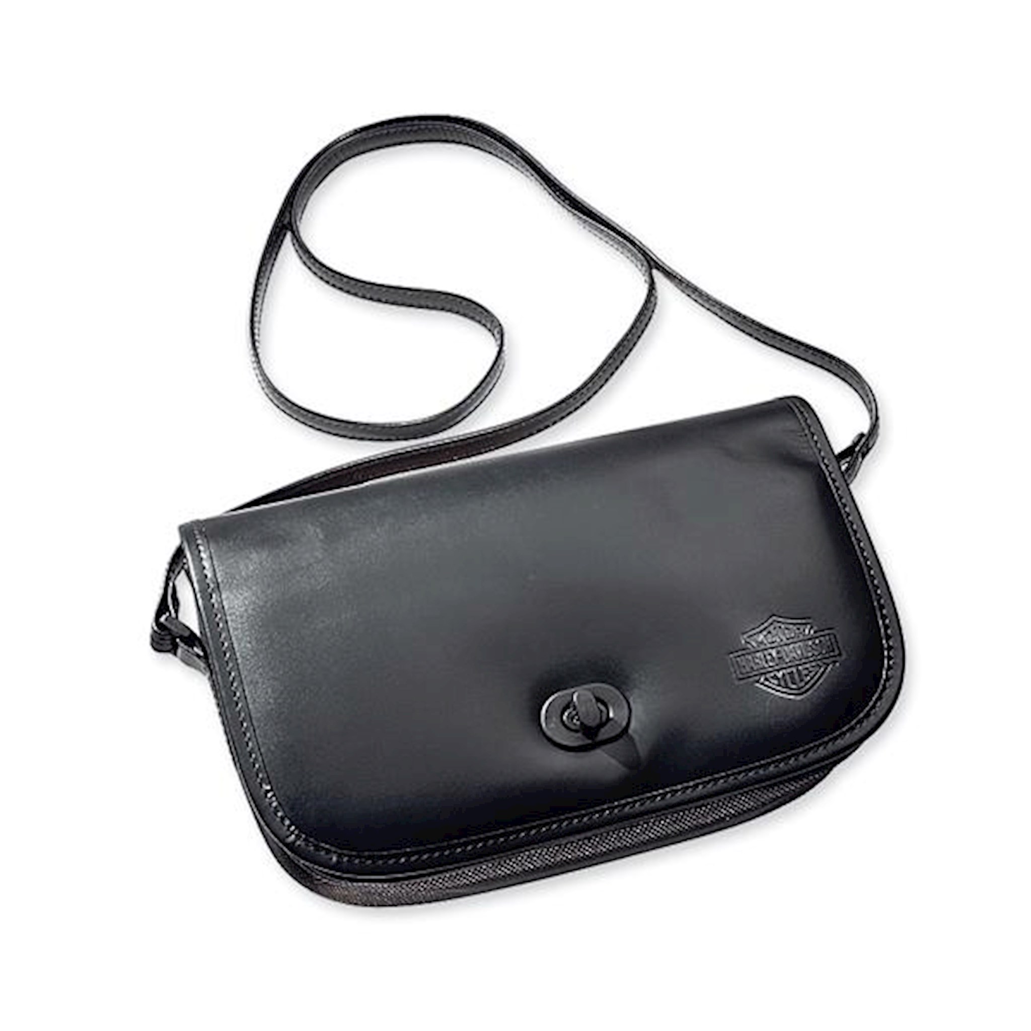 Combine the on-bike storage of a windshield bag with the take-along convenience of a handbag. Constructed of leather and nylon, this durable and spacious bag features a zippered inside pocket for cell phones, cameras, wallets or sunglasses. The convenient mounting system allows easy attachment to the windshield and the quick-detach buckle lets you take it with you when you leave your bike. The purse-length leather shoulder strap and the smooth leather flap with embossed Bar & Shield logo offer the styling flexibility to complement any Harley-Davidson® motorcycle or MotorClothes® fashion design. Maximum capacity 2.5 lbs.