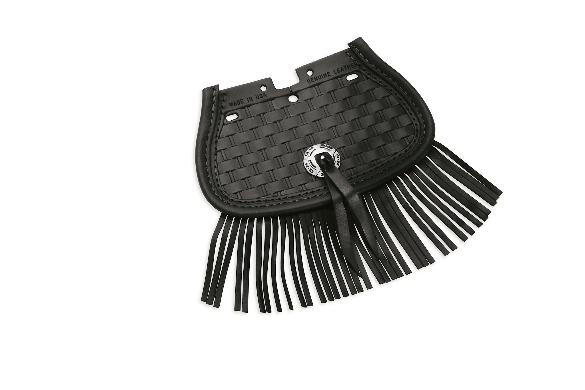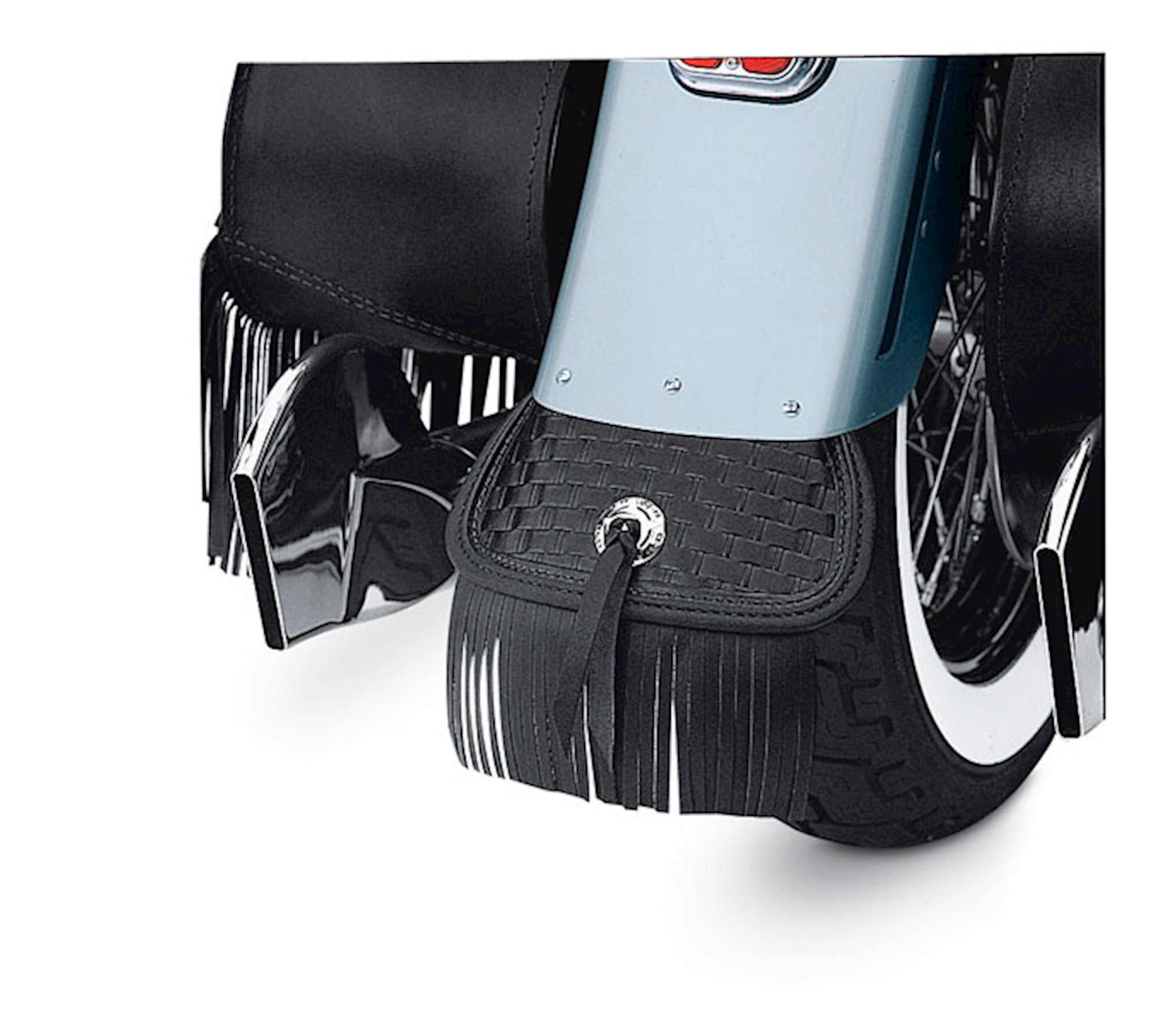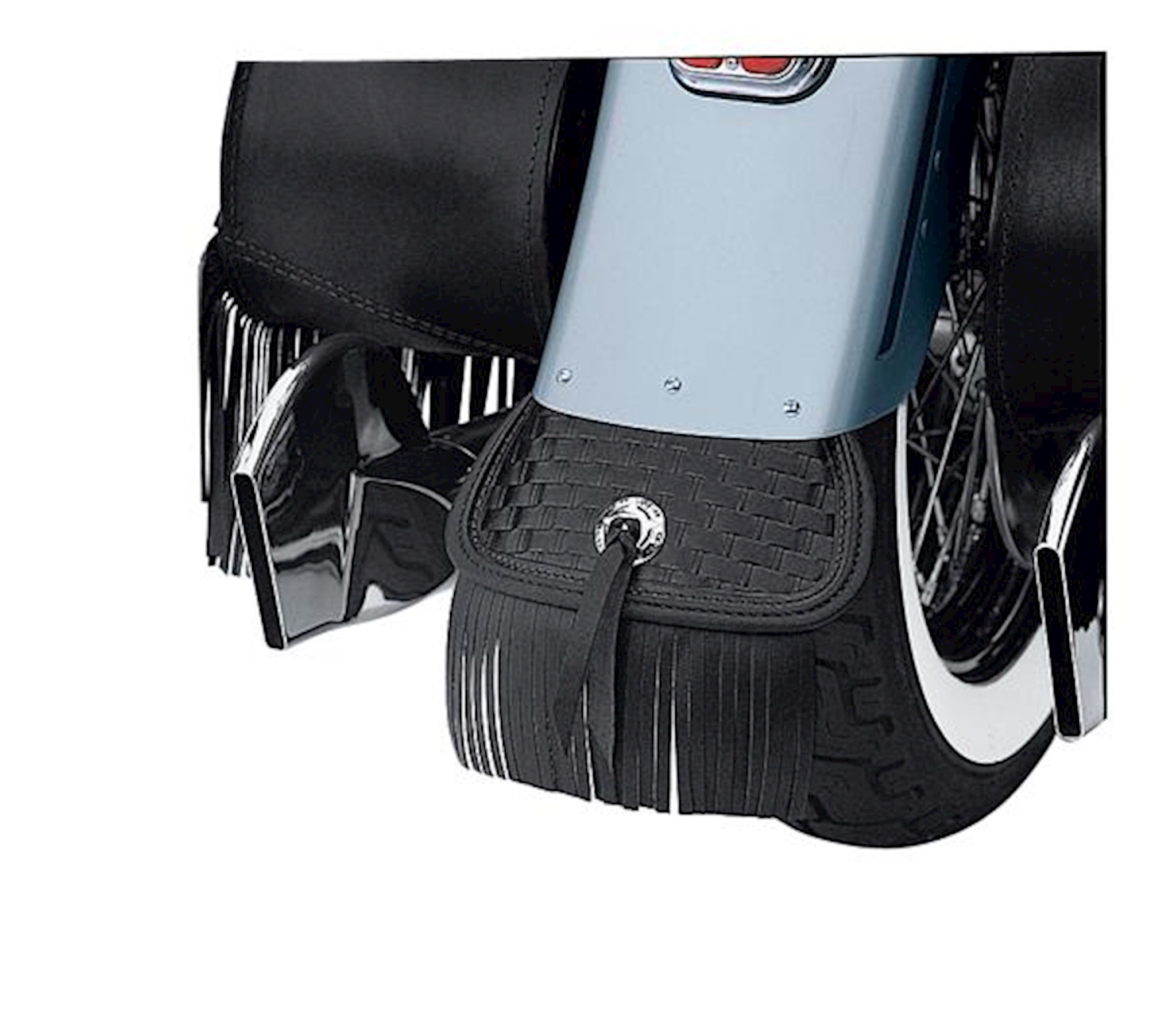 Made from premium, plated leather with black trim, these flaps have fringe and an '97-'03 FLSTS concho and black trim. Includes chrome hardware, support bracket and fender mounting template.