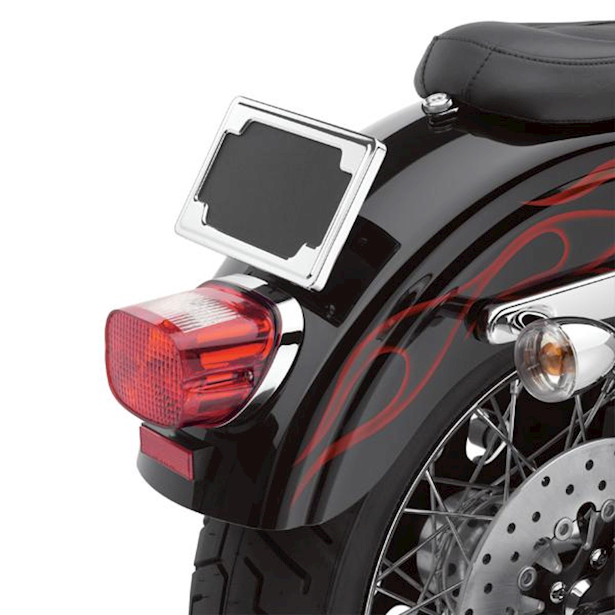 Wrap your license plate in chrome. This mirror-finish license mount tips the plate back for a sleek appearance and conceals the mounting hardware for a custom look. The front frame covers the license holes and the mirror-smooth back plate hides the unfinished rear of the plate. Kit accepts plates measuring to 7.25" x 4.25" (184 x 108mm). Kit includes installation hardware and rear fender reflector.