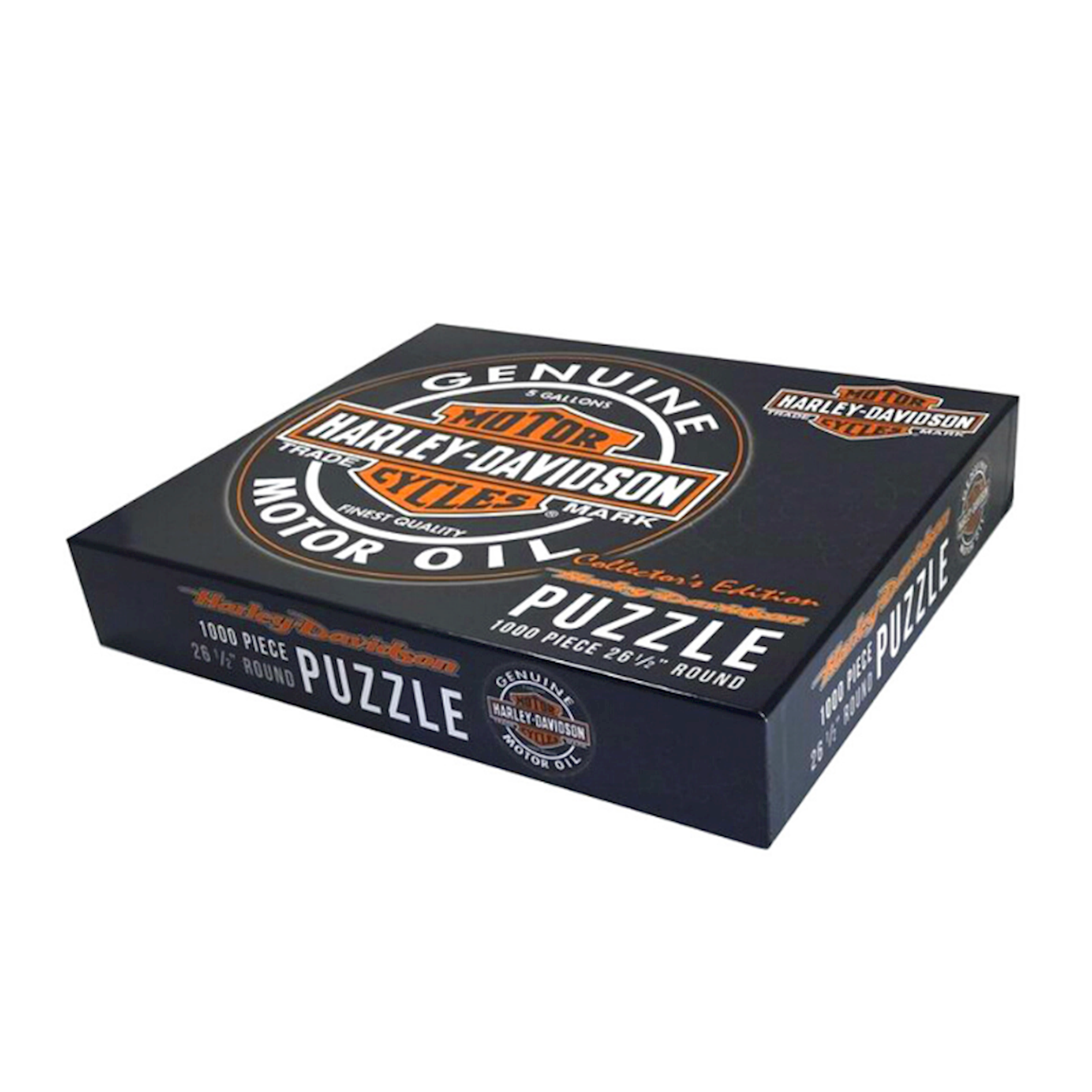 Harley-Davidson® Genuine H-D Oil Can Puzzle featuring Trademark Bar & Shield with Motor Oil graphics. 1,000 pieces. Dimensions: 26.5" Round.