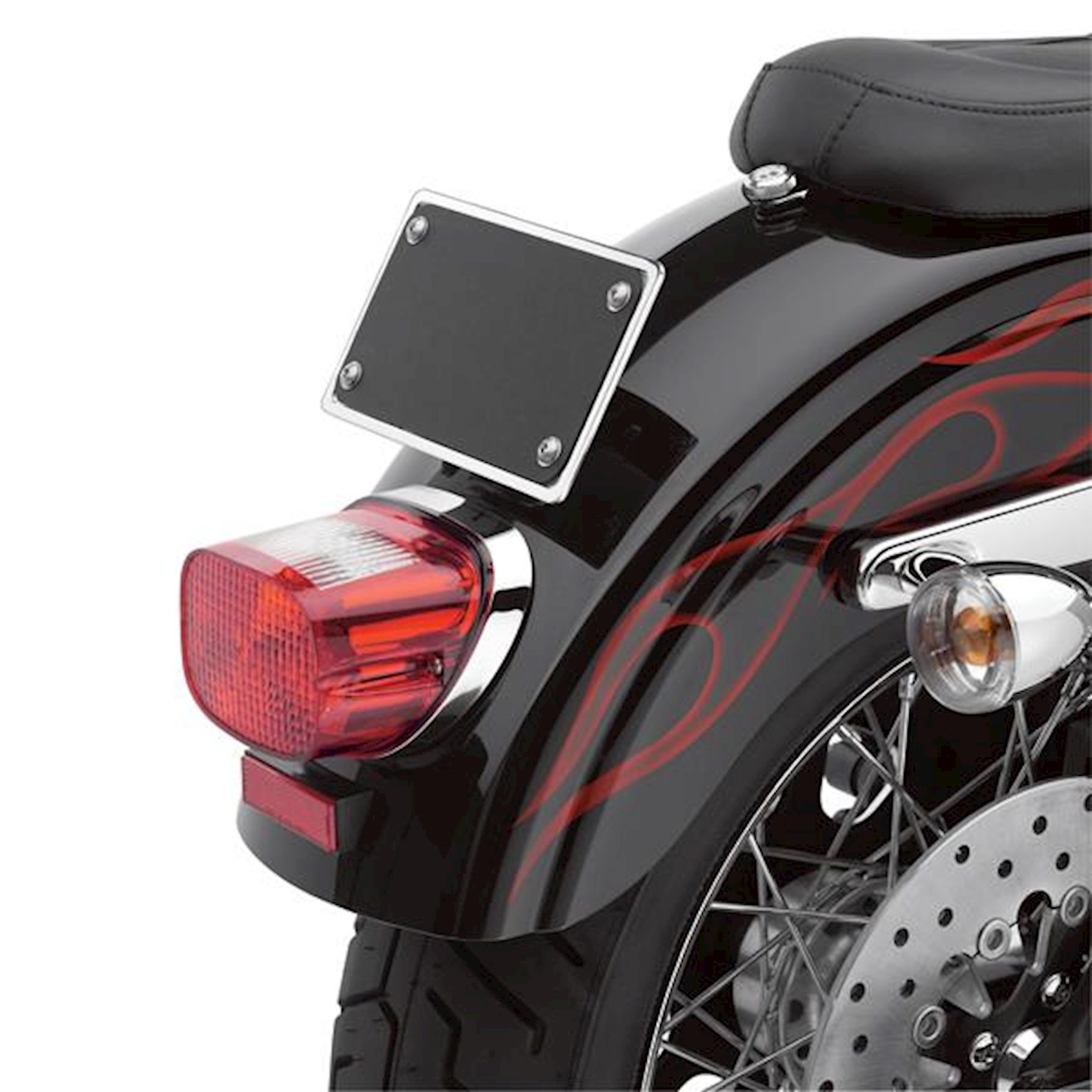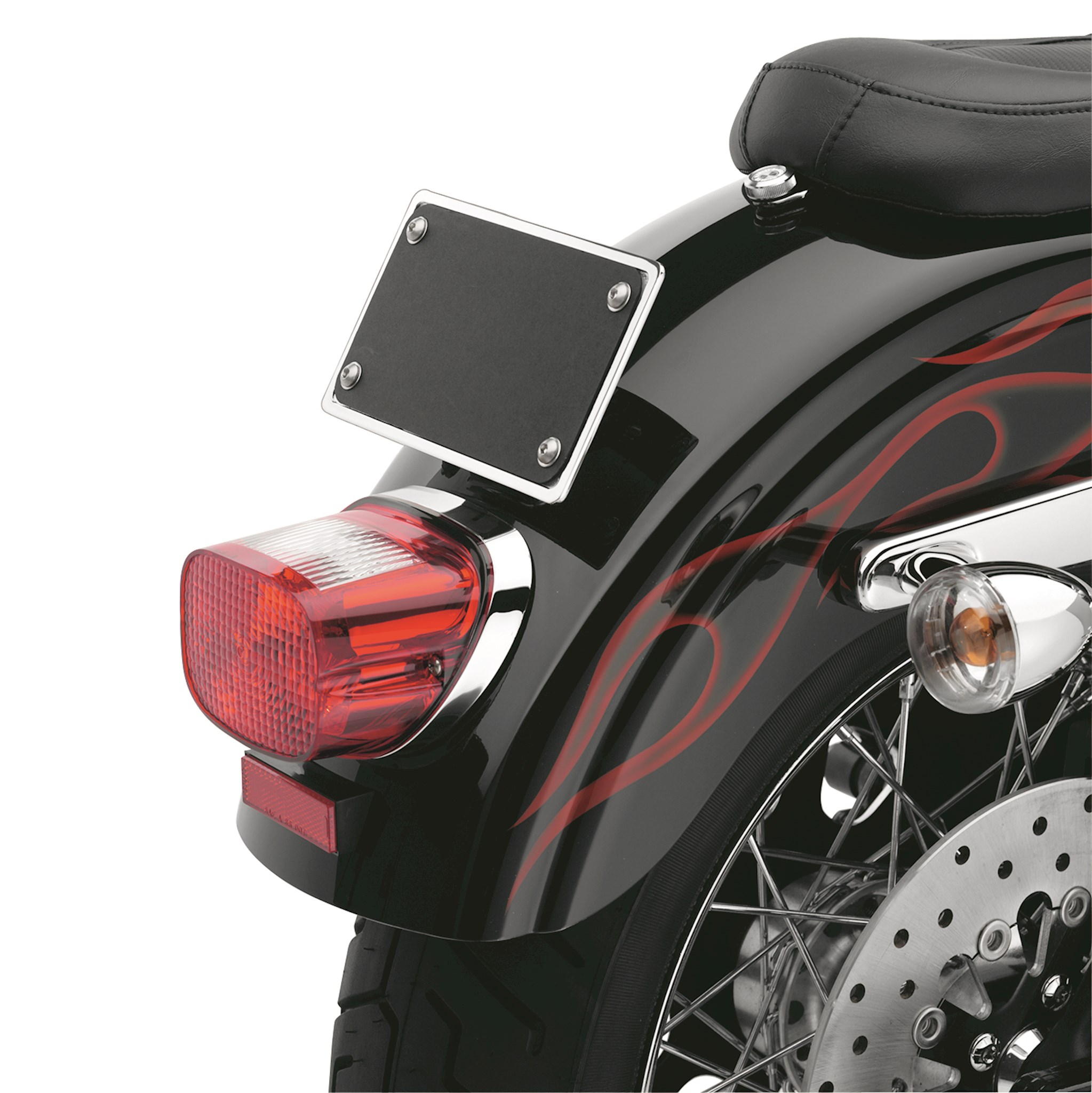 Showcase your laid-back attitude by replacing the stand-up license plate mount. Chrome-plated die-cast mount tips the license plate back for a low-profile style. Kit accepts plates measuring to 7.25" x 4.25" (184 x 108mm). Kit includes chrome-plated license mounting hardware, installation hardware and rear fender reflector.
