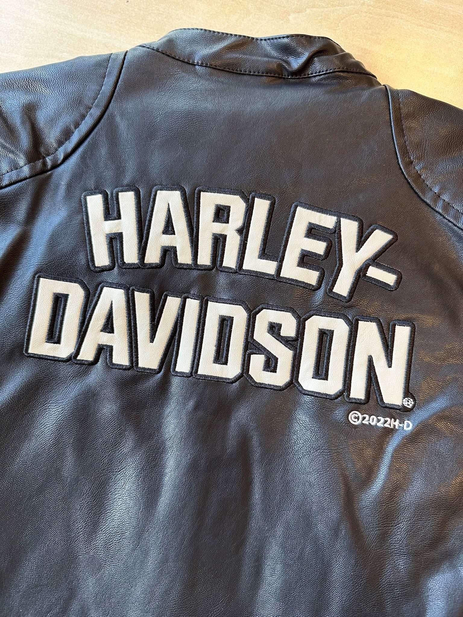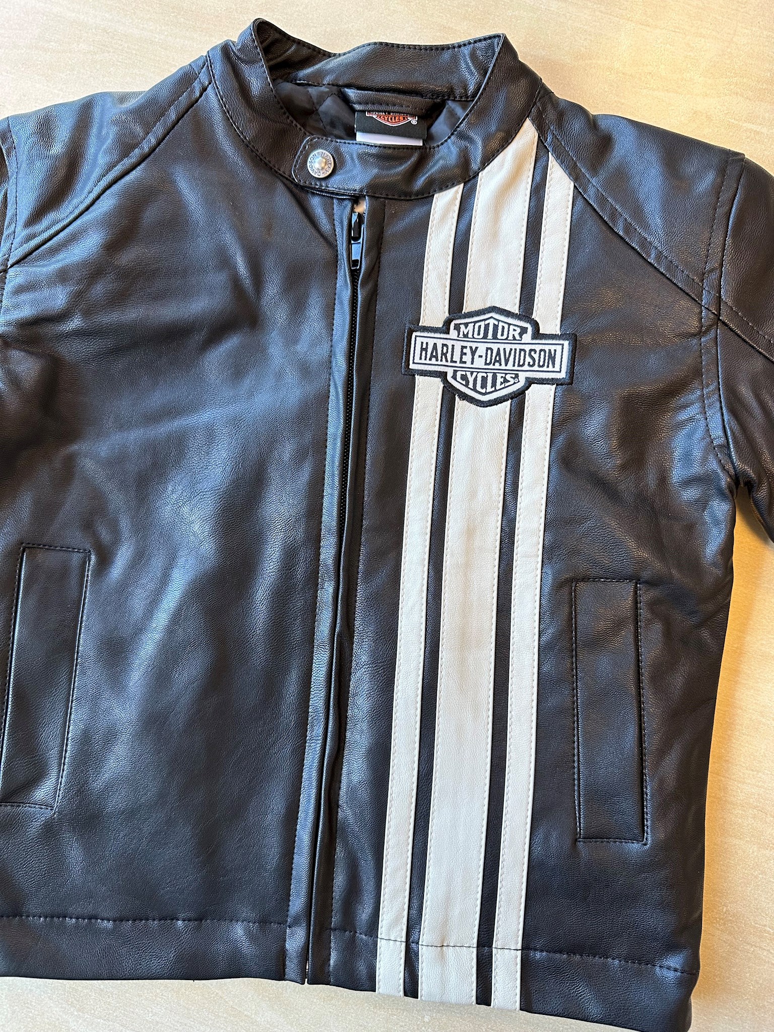 Harley-Davidson® Little Boys' Faux Leather Toddler Racer Jacket - Black. Comfy and light-weight, made from 100% polyurethane with a 100% polyester liner and fill. Awesome faux leather stripes stitched on front with an iconic woven Bar & Shield logo patch. Oversized faux leather embroidered H-D® text on back. Zippered front with snap collar. Two hand-warmer pockets. Awesome jacket for your mini Harley® rider.