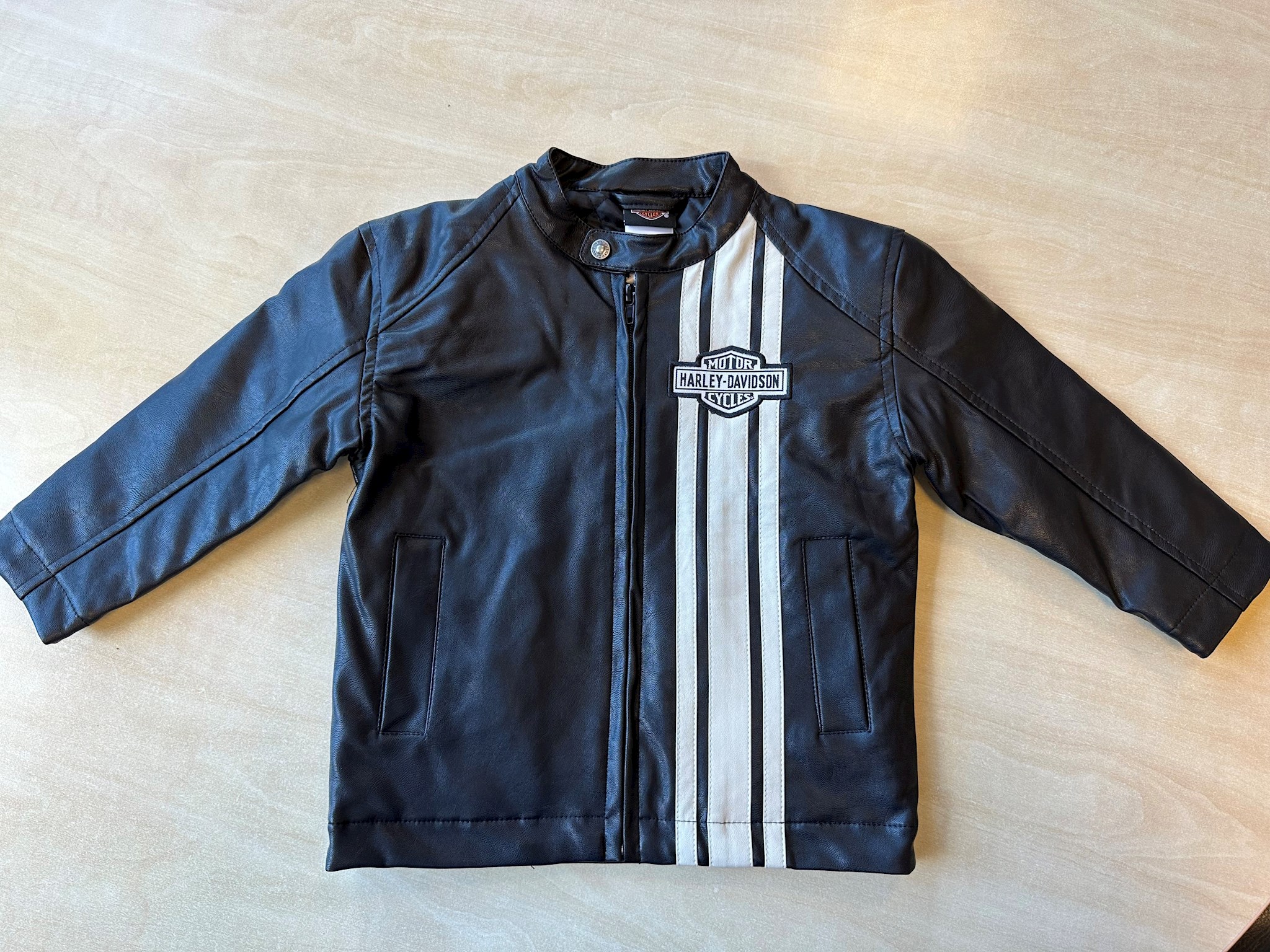 Harley-Davidson® Little Boys' Faux Leather Toddler Racer Jacket - Black. Comfy and light-weight, made from 100% polyurethane with a 100% polyester liner and fill. Awesome faux leather stripes stitched on front with an iconic woven Bar & Shield logo patch. Oversized faux leather embroidered H-D® text on back. Zippered front with snap collar. Two hand-warmer pockets. Awesome jacket for your mini Harley® rider.