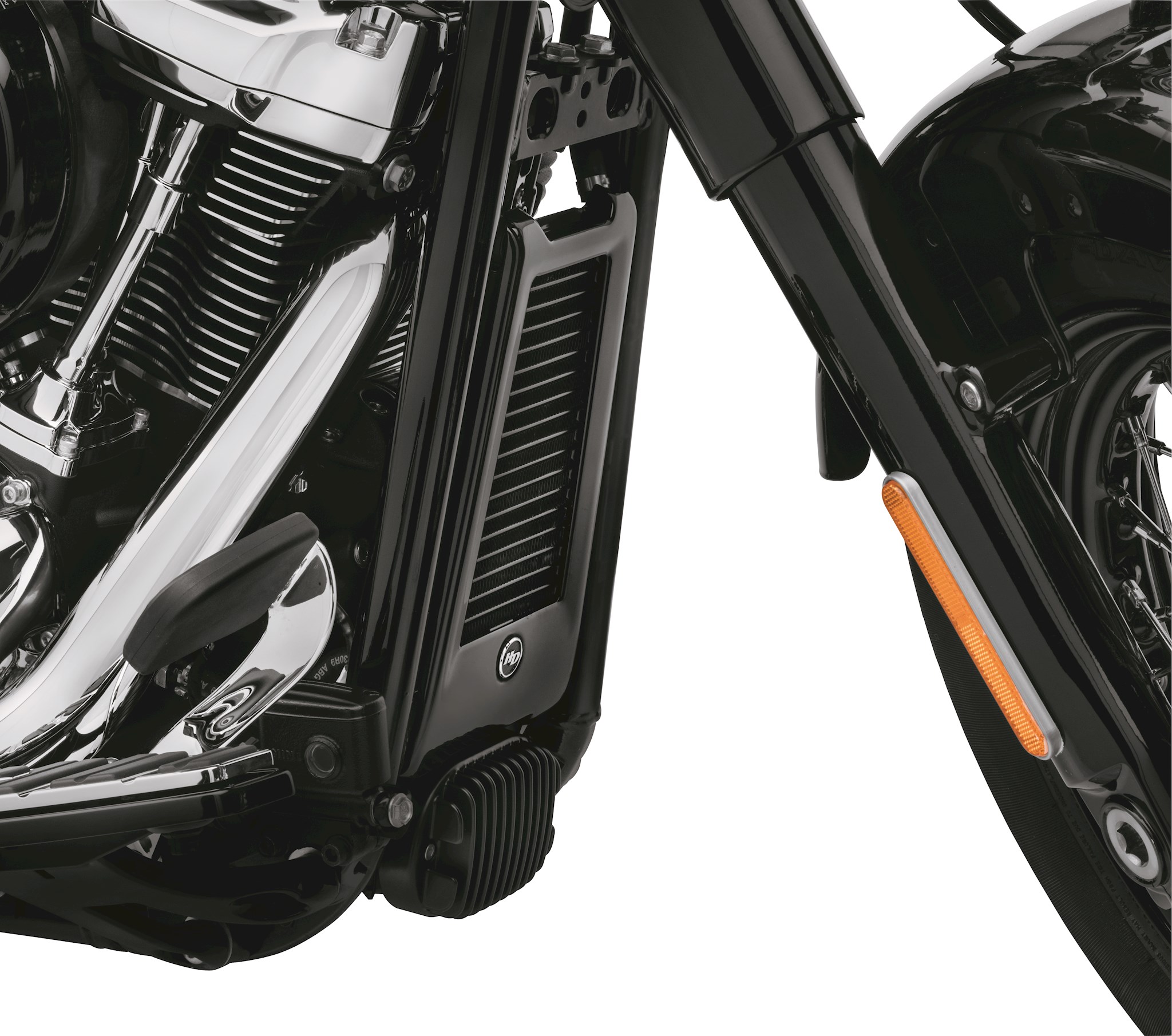 Dress the oil cooler in style. The cover fills the area between the frame downtubes for a complete custom look, without disturbing the airflow across the cooler's surface. This Oil Cooler Cover replaces the plastic surround, and because it hugs the contours of the cooler body, it does not interfere with engine guard installation. Available in your choice of chrome or gloss black finish, the easy-to-install cover kit includes all required mounting hardware. Fits '18-later Softail models.