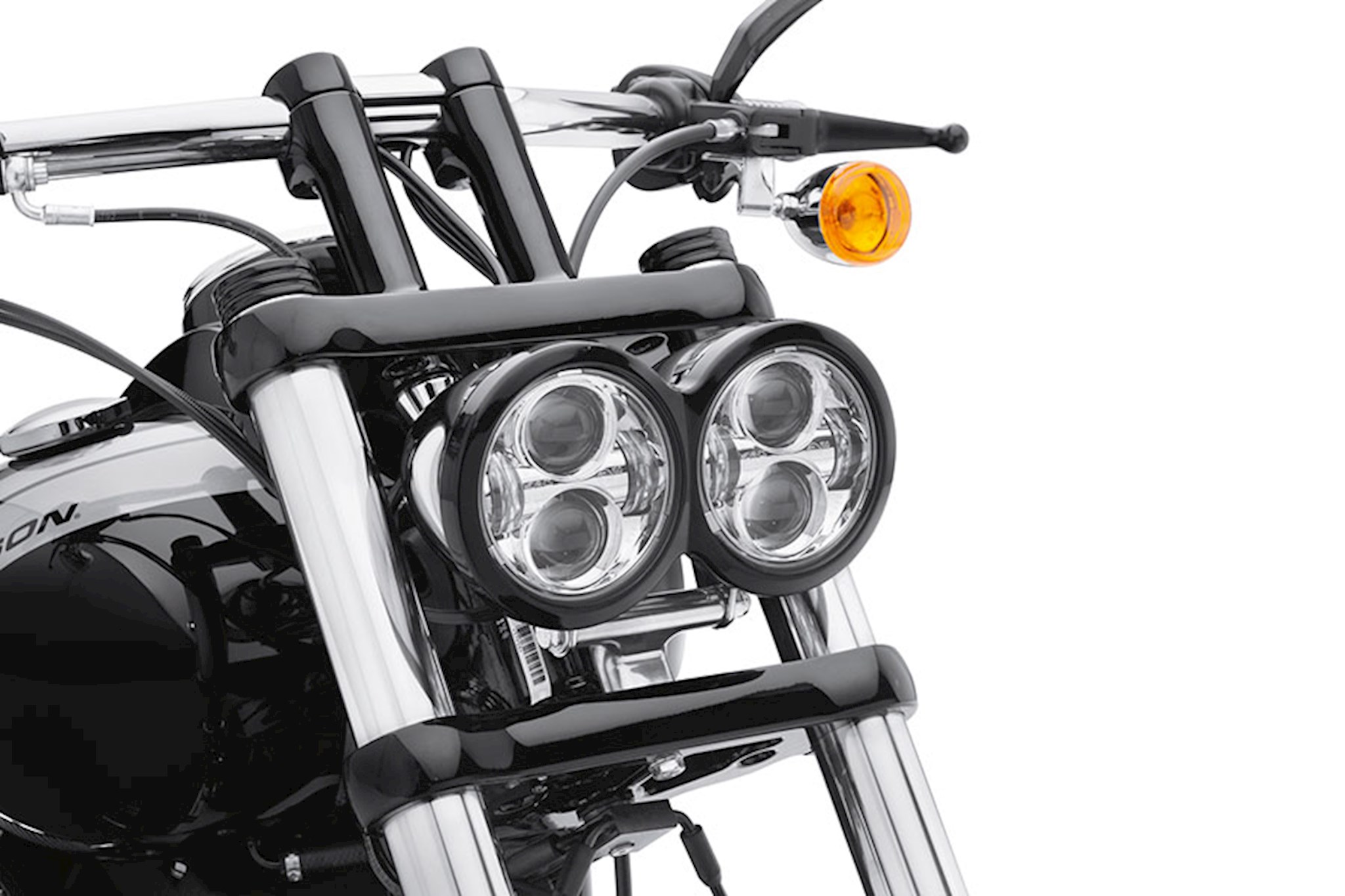 Fat Bob® Daymaker LED Headlamp Kit features separate left and right lamps that fit easily in the Fat Bob model's unique dual headlamp housing. Each lamp features a single top-mount low-beam projector lens, a matching bottom-mount high-beam projector lens and 2 "D" shaped fill-light lenses. The LED lamps are DOT compliant for use in all 50 states. Fits '08-later FXDF models. Does not fit International models.