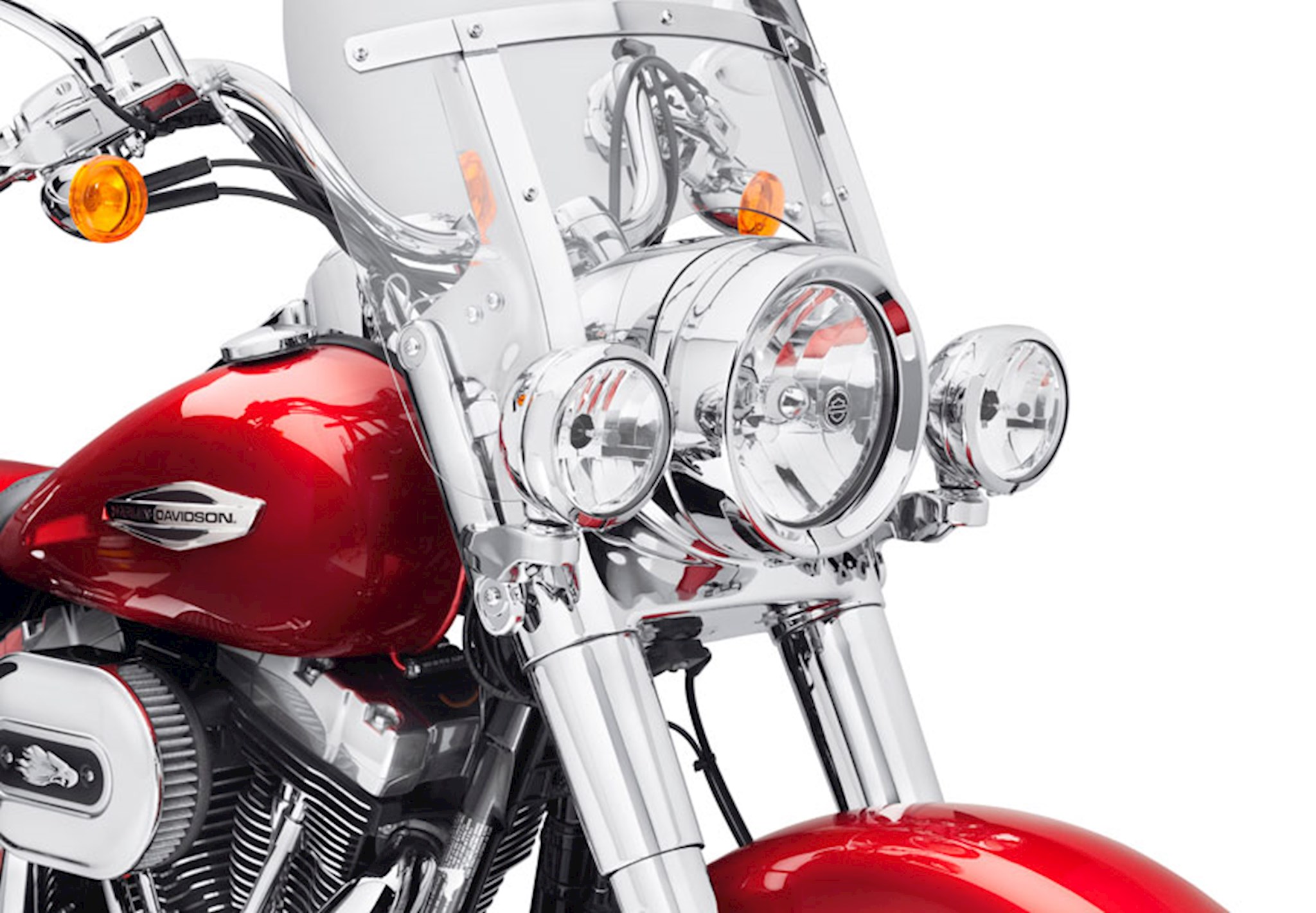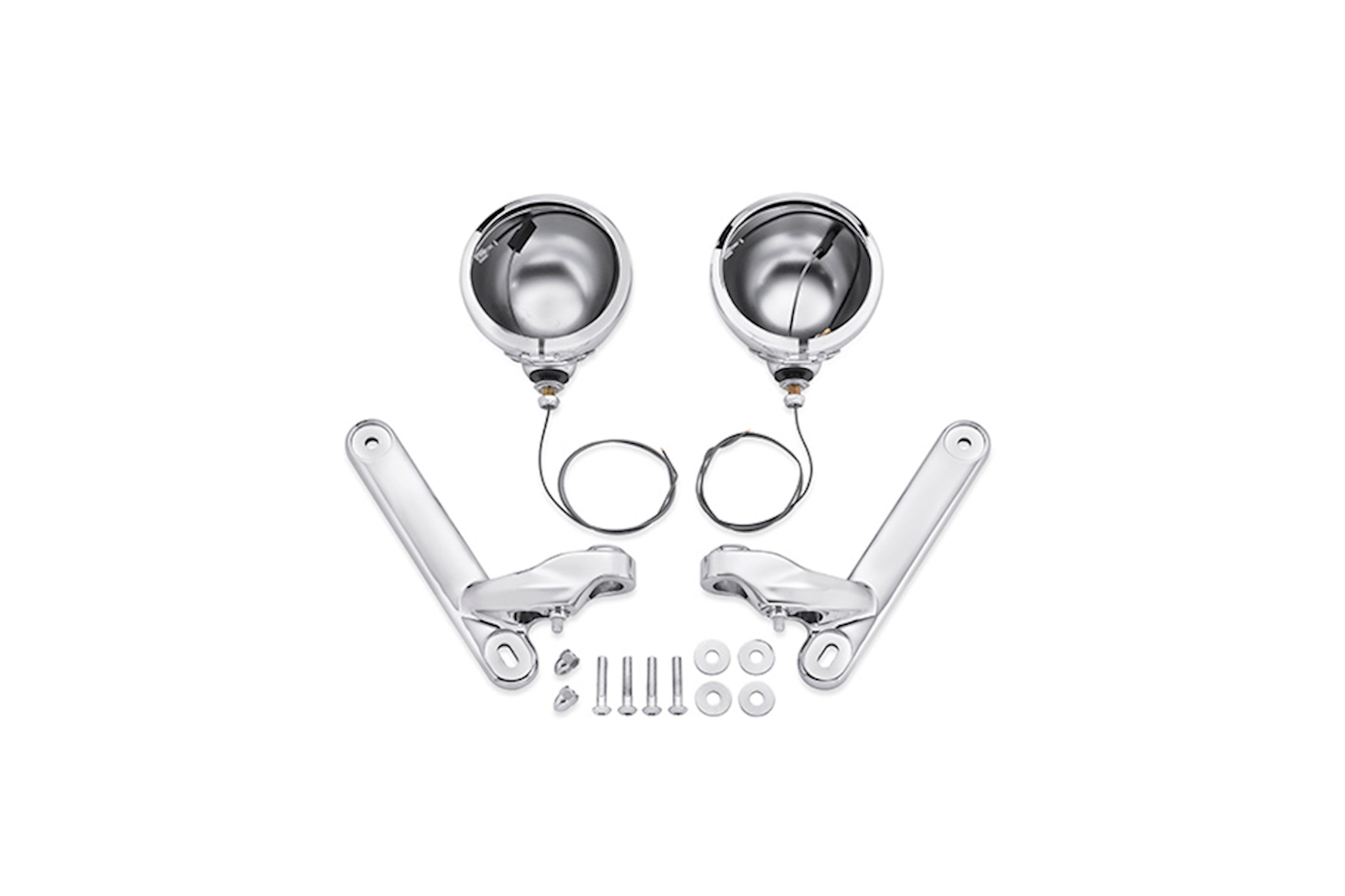 Shaped by the wind, this Auxiliary Lighting Kit follows the contours of the triple tree and headlamp shell for a custom look. The chrome-plated cantilever brackets serve as stylized mounting points for the passing lamp housings and eliminate the cross brace and flat side supports of traditional auxiliary lamps. The brackets can also accommodate the bike's Original Equipment bullet turn signals if you choose to relocate them from the handlebar for a clean look. Kit includes die-cast aluminum brackets, lamp housings and all required wiring and hardware. All you need to add is your choice of bulb style and you'll light up the open road. Bulbs sold separately.