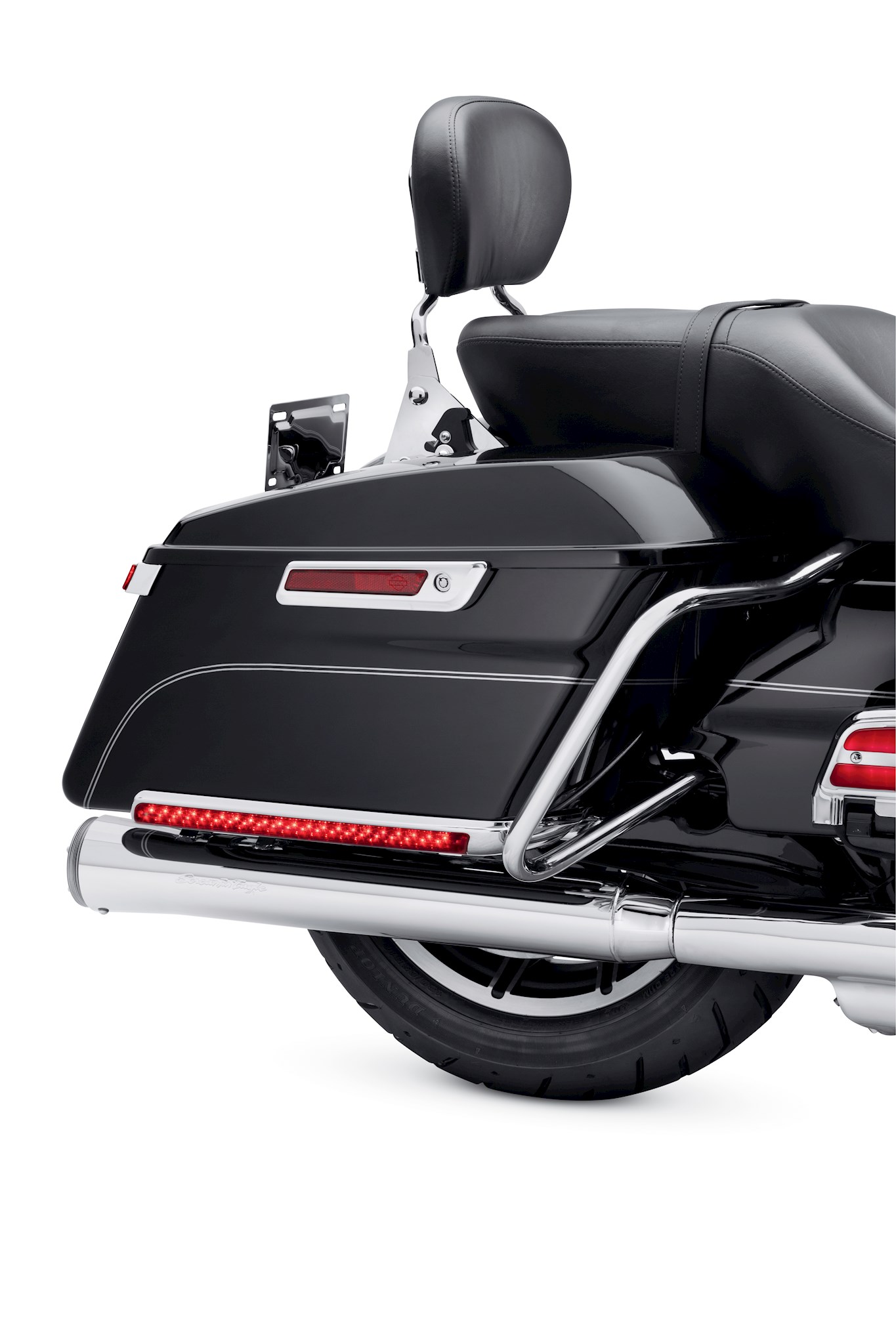 This wrap-around Side Marker Light Kit adds a splash of light to the lower edge of the color-matched saddlebags. Available in your choice of red or smoked lens, the bright band of LED lamps is housed in a mirror chrome frame that hugs the bottom of the saddlebag. The low-profile self-adhesive Electra Glo™ lamps can be installed on models equipped with standard-length saddlebags, and are compatible with optional saddlebag guard rails. Easy to install kit includes left and right lamp and quick-disconnect wiring harness. Fits '14-later Touring models with hard saddlebags. Not compatible with CVO™ or other models equipped with Stretched Saddlebags. Installation requires separate purchase of Electrical Connection Update Kit P/N 69200722.