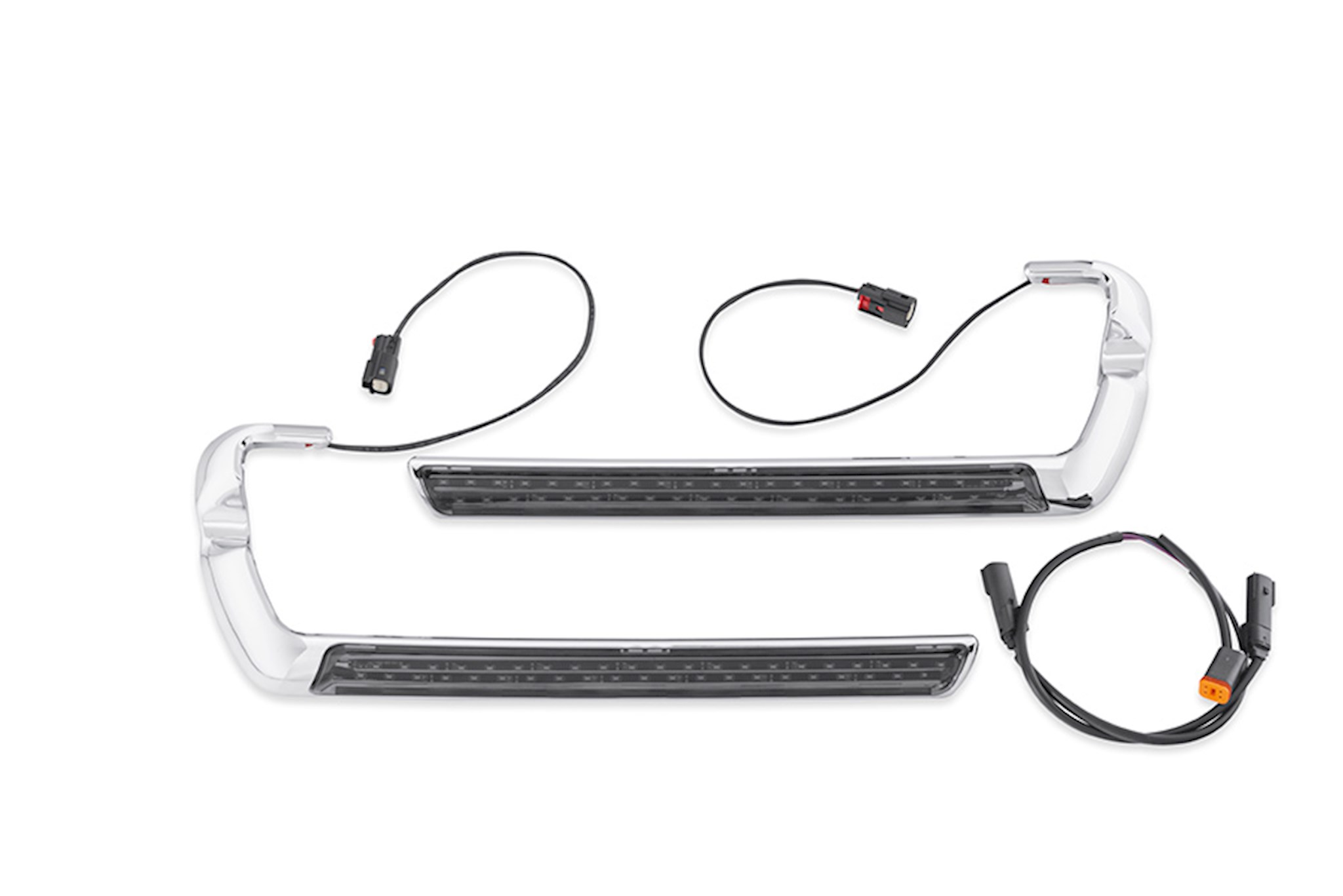 This wrap-around Side Marker Light Kit adds a splash of light to the lower edge of the color-matched saddlebags. Available in your choice of red or smoked lens, the bright band of LED lamps is housed in a mirror chrome frame that hugs the bottom of the saddlebag. The low-profile self-adhesive Electra Glo™ lamps can be installed on models equipped with standard-length saddlebags, and are compatible with optional saddlebag guard rails. Easy to install kit includes left and right lamp and quick-disconnect wiring harness. Fits '14-later Touring models with hard saddlebags. Not compatible with CVO™ or other models equipped with Stretched Saddlebags. Installation requires separate purchase of Electrical Connection Update Kit P/N 69200722.