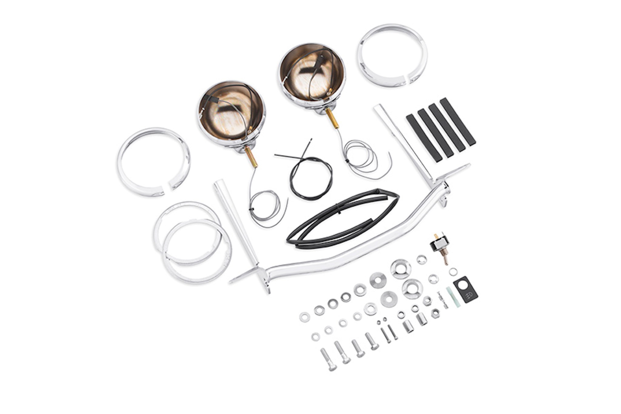 Function and style in one. This Auxiliary Lighting Kit features attractive mounting brackets and a tubular crossbar contoured to accent the headlamp. Available in bright chrome or gloss black finish, the kit includes lamp housings and all required wiring, toggle switch and hardware. All you need to add is your choice of bulb style and you'll light up the open road. (Bulbs sold separately.) Fits '00-later FLS, FLSTF, FLSTFB and '06 FLST models.