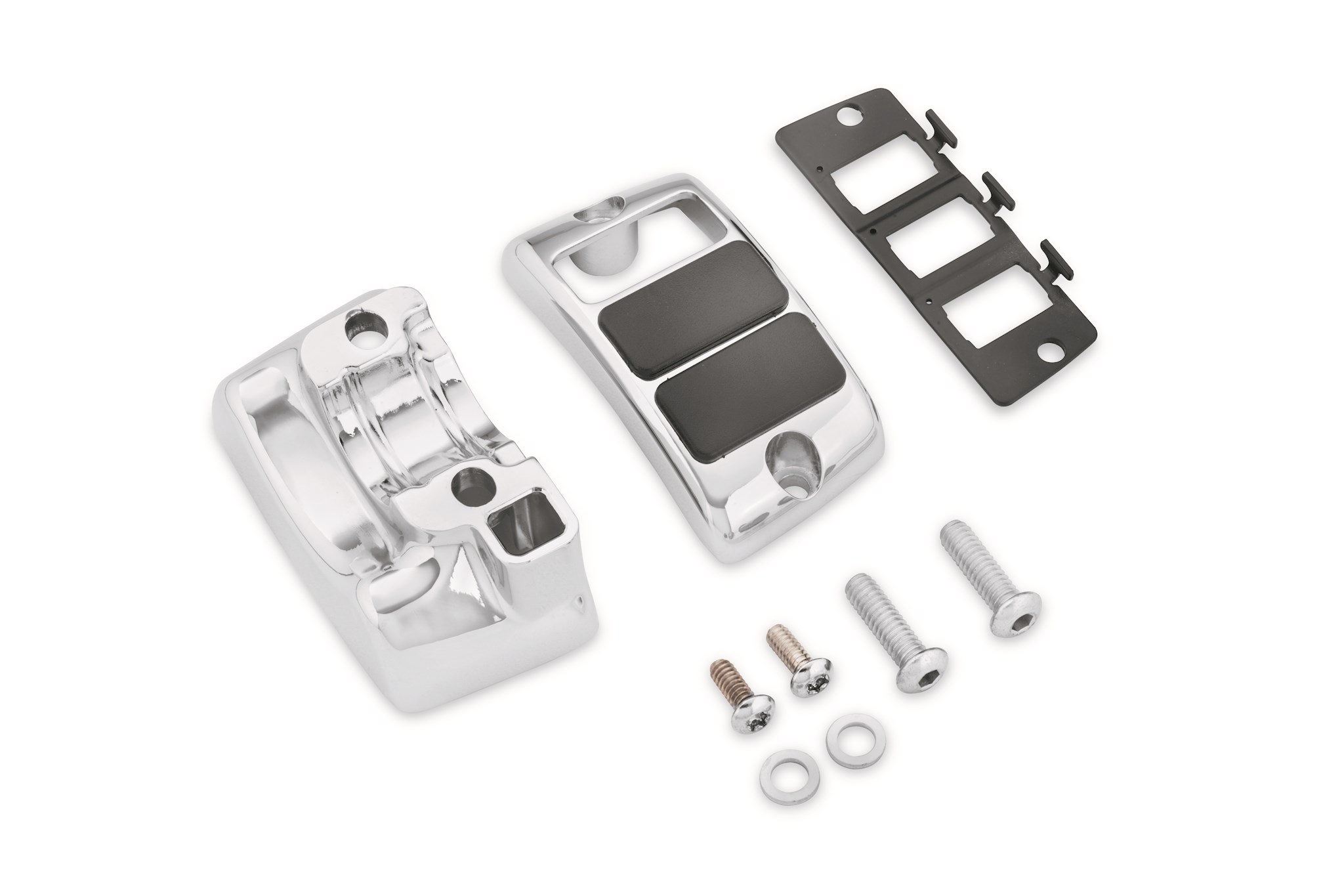 Keep your eyes on the road and your hands on the grips with these easy-to-reach Auxiliary Accessory Switch Housings. Available for left and right hand control clusters, these housings will allow you to install up to six switches (when two housings are used) to control various electrical devices. Available in black to match Original Equipment switch housings or a bright chrome finish to complement accessory Chrome Switch Housing Kits. All necessary mounting hardware is included. Switches sold separately. Fits '96-later VRSC™, XL, XR, Dyna®, Softail® and Touring models (except '15-later Road Glide® models). Does not fit models equipped with Large Diameter Handlebars, Handlebar-Mounted GPS, Boom!™ Audio Cruiser Amp & Speaker Kits or Tour-Pak® Mounted CD Changer P/N 77184-01. '04-later XL and XR models require separate purchase of (2) Screw P/N 3832M.