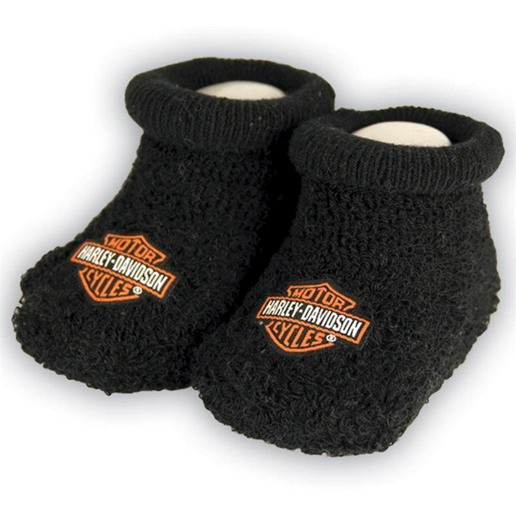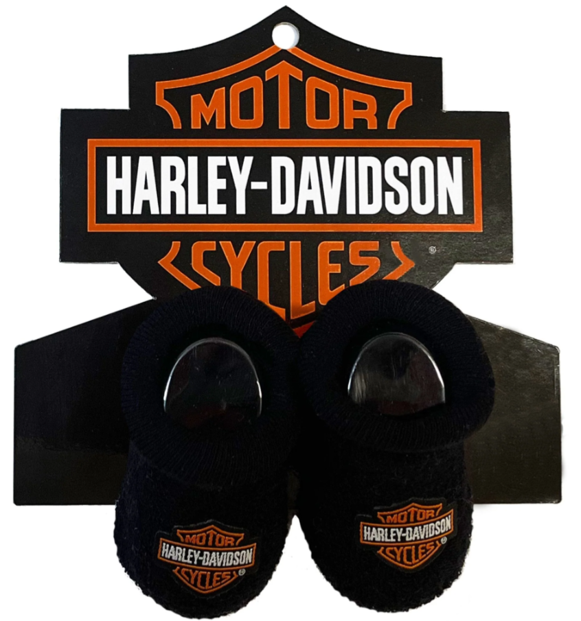 Harley-Davidson® Baby Boy's Boxed Stretch Terry Booties, Black. These adorable Baby Boy’s Booties, sized for newborn up to three months, are a perfect gift for that Harley® baby. Everyone smiles as baby pumps his baby feet with these booties, for sure. They are made with soft stretch terry cotton for warmth and ease of putting on and taking off. There is a matching appliqued Woven Bar & Shield® logo on the top of each booty. SIZE: 0-3 months. Harley-Davidson® has licensed the manufacture of their children’s clothing to SGI Apparel Group, a company well known for their dedication to perfection and ingenious designs for children’s apparel, accessories, and footwear.