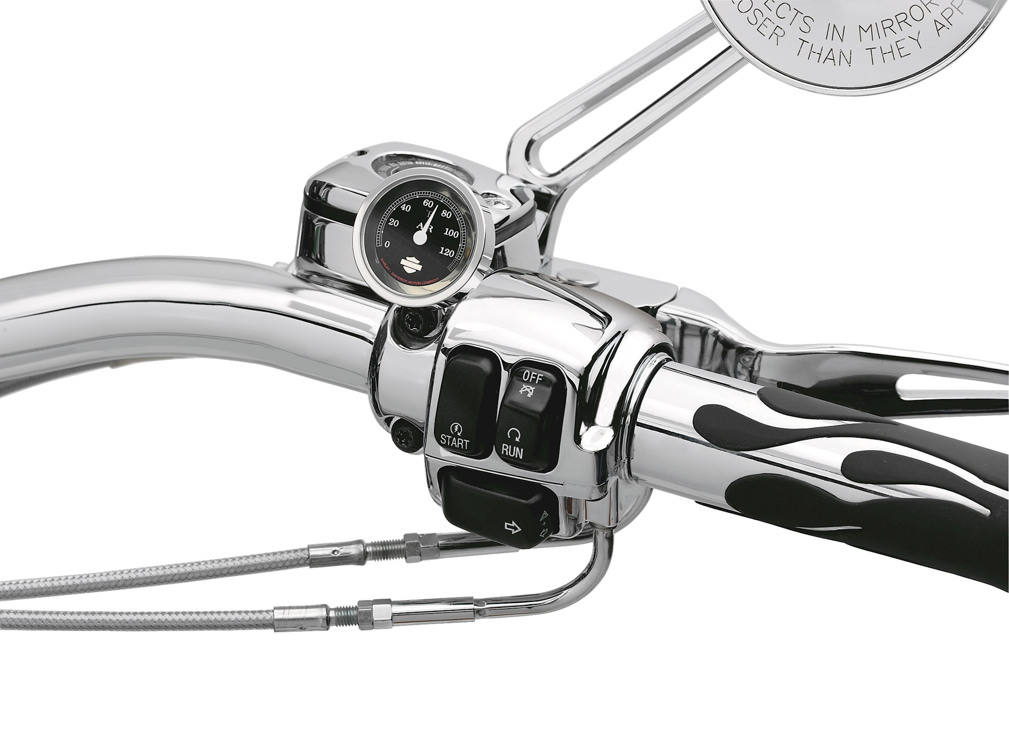 Designed to mount to the Brake Master Cylinder Clamp, this polished stainless steel temperature gauge will keep you in touch with the outside air temperature. Styled to match the Original Equipment gauge design and the Clutch Lever Bracket Clamp Clock, the thermometer is available with black or silver face. This waterproof gauge is simple to install. Kit includes clutch lever mounting bracket, but if you need to mount the clock on another area of the handlebar, select from the available Handlebar Clock Mount Clamps (sold separately). Fits all models (except '15-later XG). Not for use with Auxiliary Accessory Switch Housing Kits.