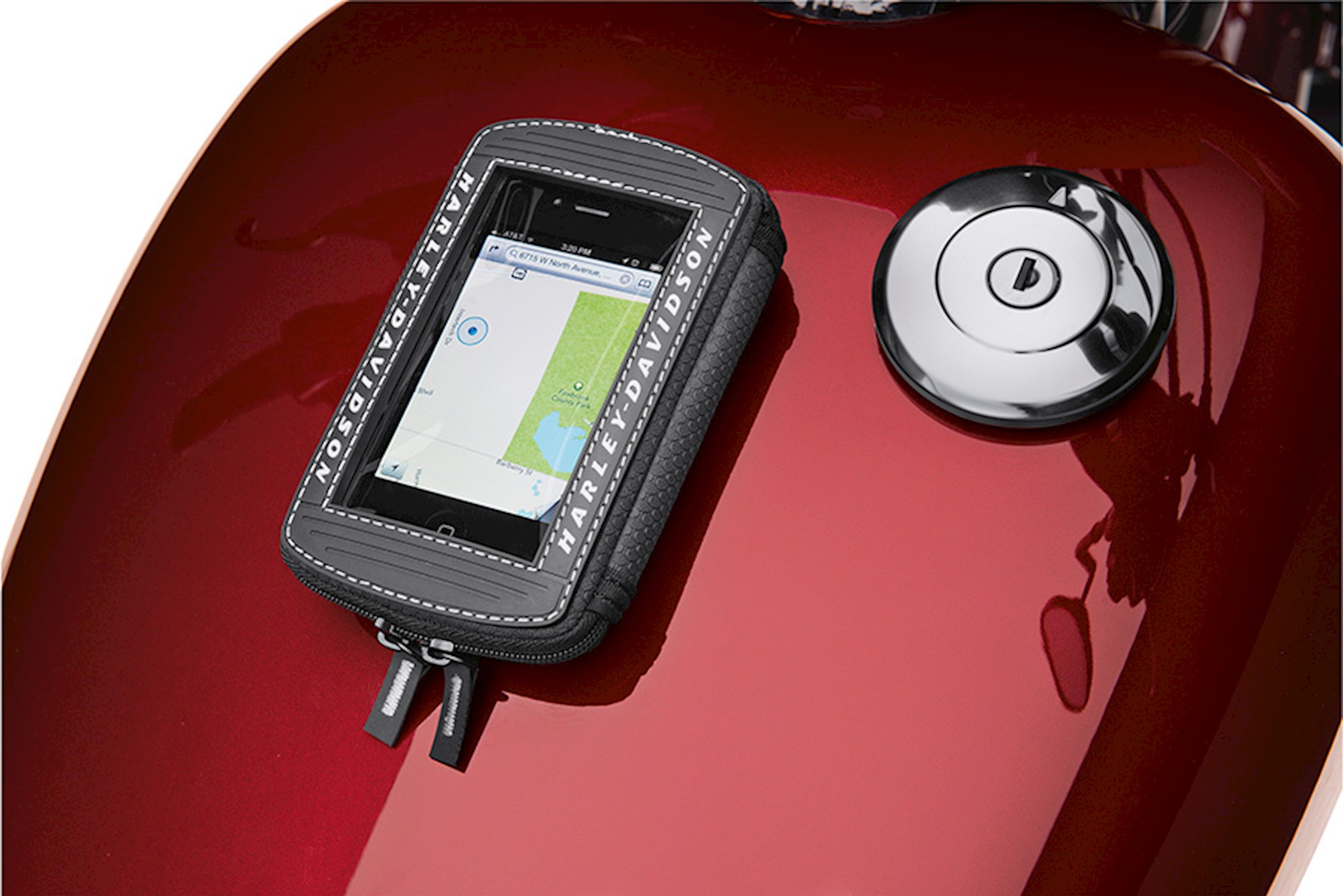 The neoprene jacket offers hard-core protection for your portable music device, while the built-in magnets hold the pouch securely to the fuel tank. The clear play-through window permits touch-screen control and the anti-skid interior allows the pouch to accommodate players of various sizes. The clamshell design makes inserting your player into the pouch quick and easy and the double zipper allows for headphone and output cables to exit the pouch at any point on top, bottom or one side of the pouch. Works well with many MP3 and other personal music players, but should not be used with hard-disk memory players. Window measurement: 2.25" W x 4.0" H.