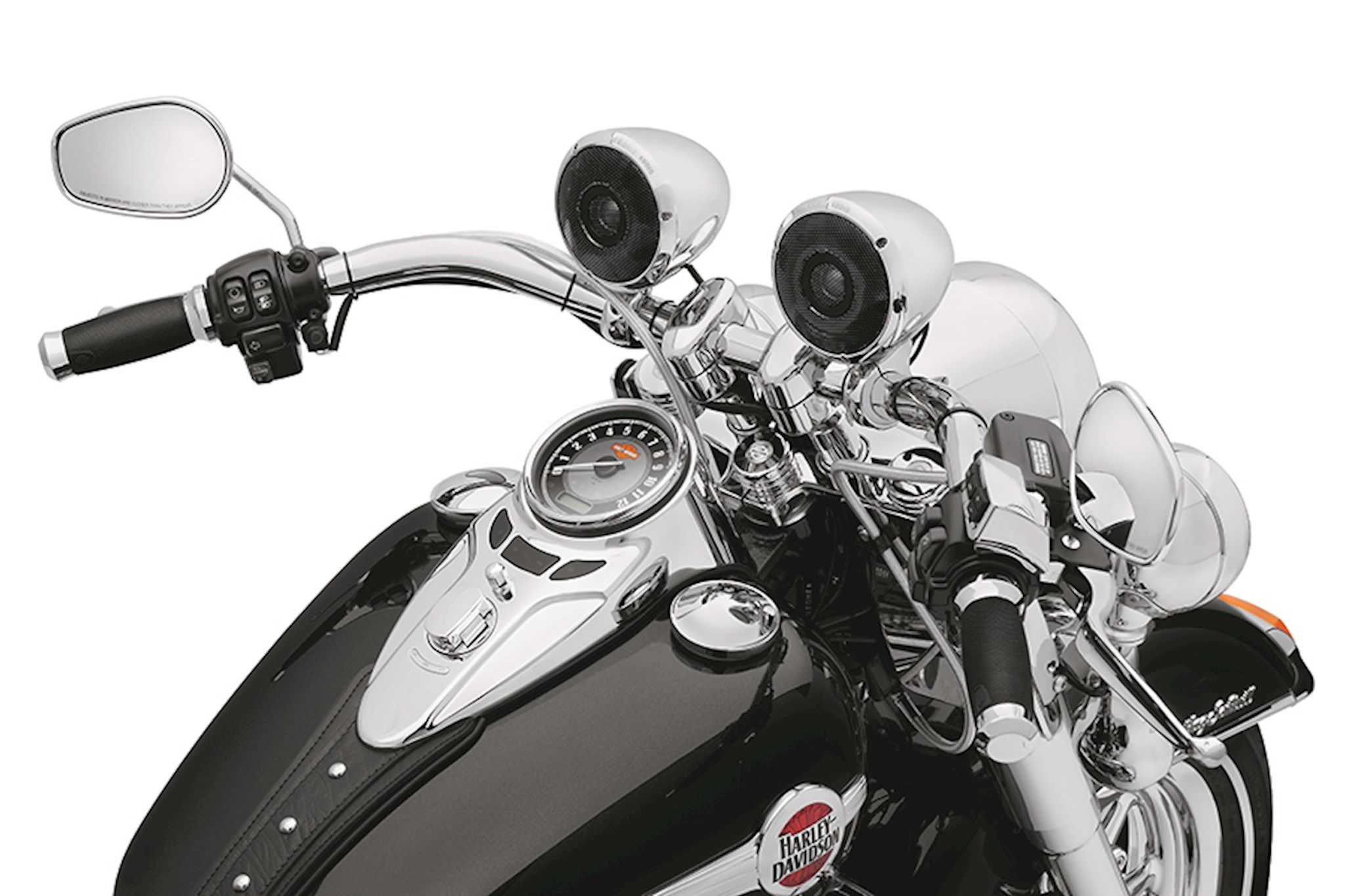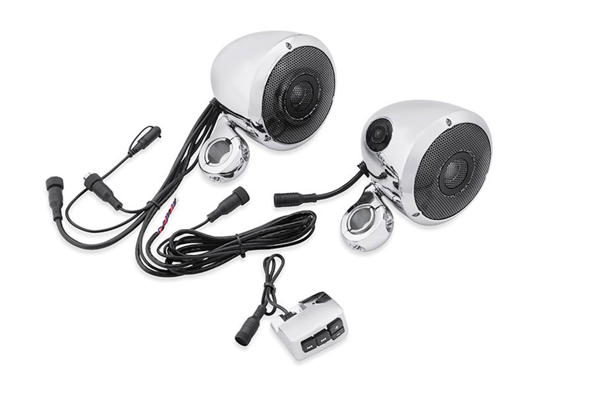 Boom!™ Audio Cruiser Amp and Speaker Kits provide amplified music through two great-sounding handlebar-mounted speakers. The bullet shaped enclosures house a 3.6” woofer and separate 1” tweeter that combine to deliver rich bass notes and sparkling highs. The waterproof speaker elements are protected behind stylish metal grills that are finished with a center-mounted trim ring. Powered by a self-contained 40 watt RMS amplifier, these speakers can cut through the background noise and deliver clear, crisp sound. Cruiser Speakers feature wireless Bluetooth® technology for easy connectivity with a smart phone, GPS unit or other music player, and can also connect to traditional music players through a standard 3.5mm stereo auxiliary input. Available in chrome or black finish, the individual speaker pods clamp to either a 1.0" or 1.25" handlebar and can be adjusted to direct the sound toward the rider. Thumb-activated switches that control on/off/pause, track forward/back, and volume level are conveniently mounted above the right switch housing for easy reach while your hands remain on the grips. Complete kit includes all wiring and mounting hardware. For a complete 4-speaker surround-sound experience, add the optional rear sissy bar mounted Speaker Expansion Kit.