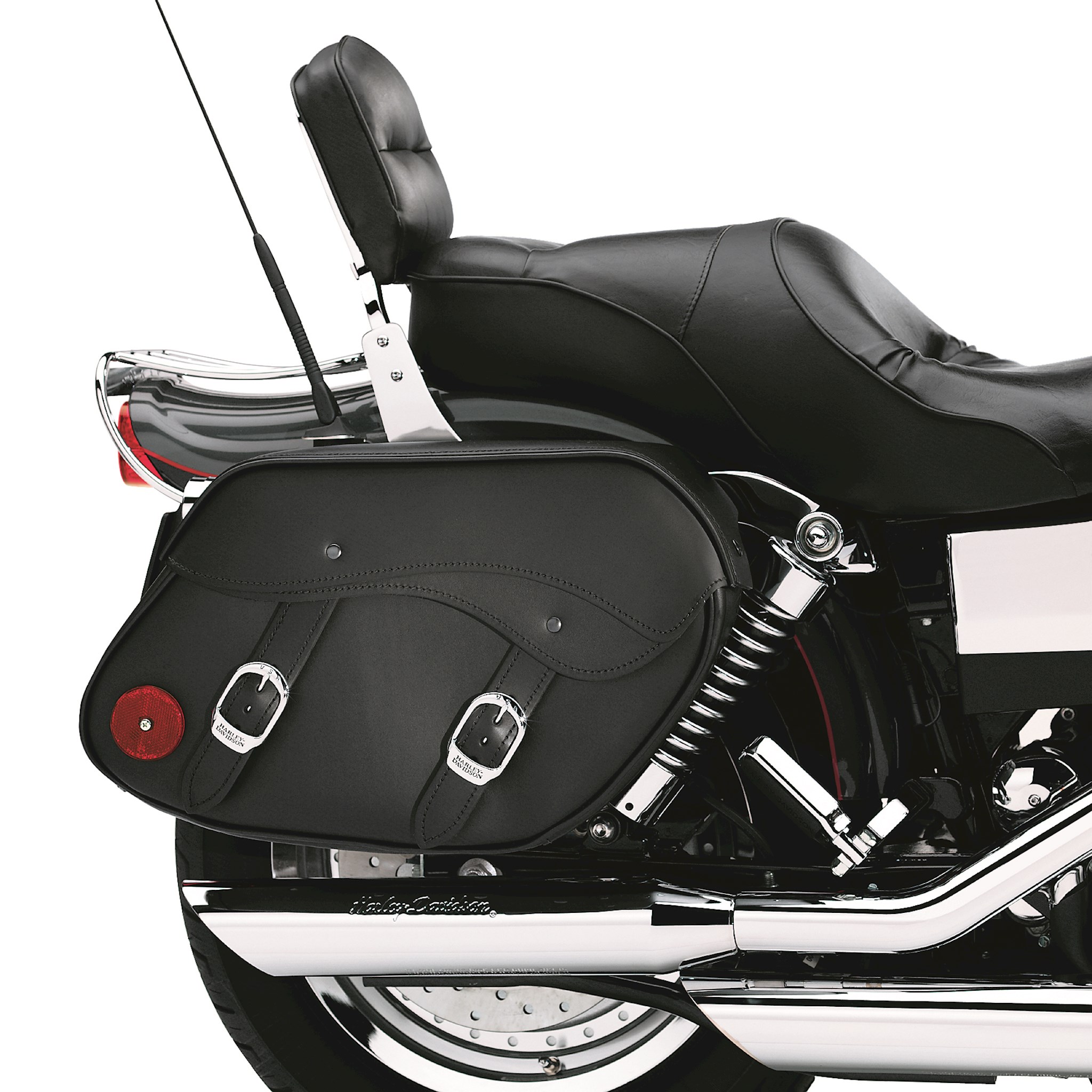Styled with sweeping lines to complement the Dyna fender, these bags feature plenty of storage space for a ride to the store or to Sturgis. The rigid plastic tub, wrapped in genuine leather, offers long-term durability. The traditional leather straps hide quick-disconnect closures for packing convenience. Luggage capacity: 2380 cubic inches total.