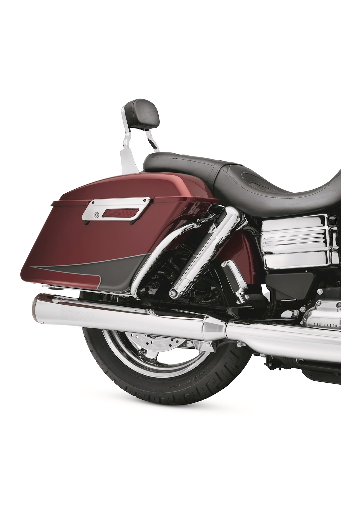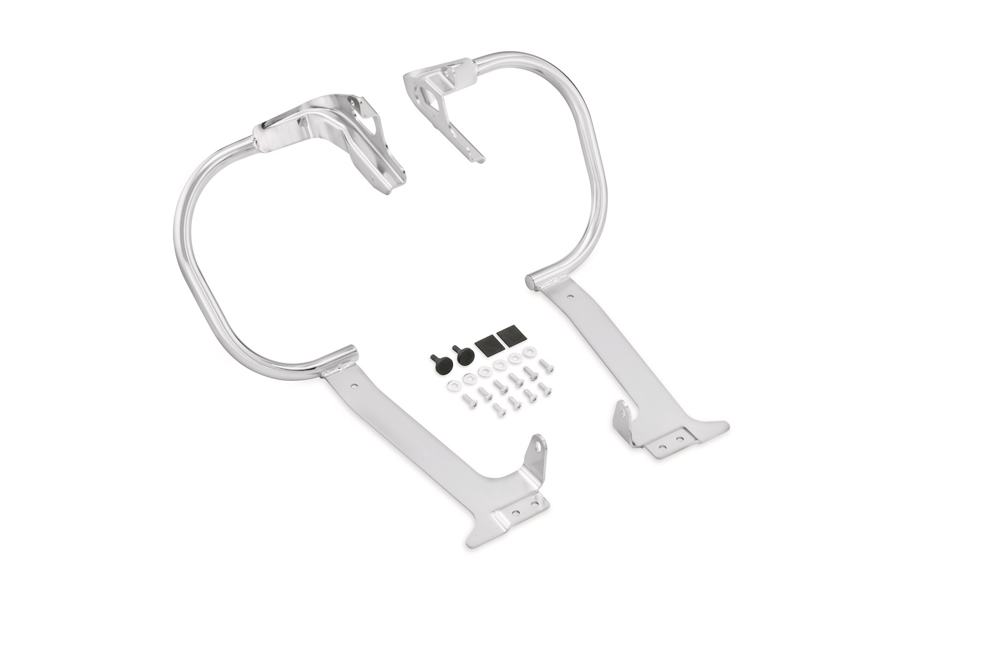 Add protection and style to your ride. These chrome guards add a traditional Bagger look to the Dyna® Switchback™ model and protect the leading edge of the saddlebags. The innovative design allows the guards to be removed with the detachable saddlebags for a stripped-down look and the integrated stand keeps the bags upright and off the ground when off the bike. Kit includes left and right guards and all necessary mounting hardware.