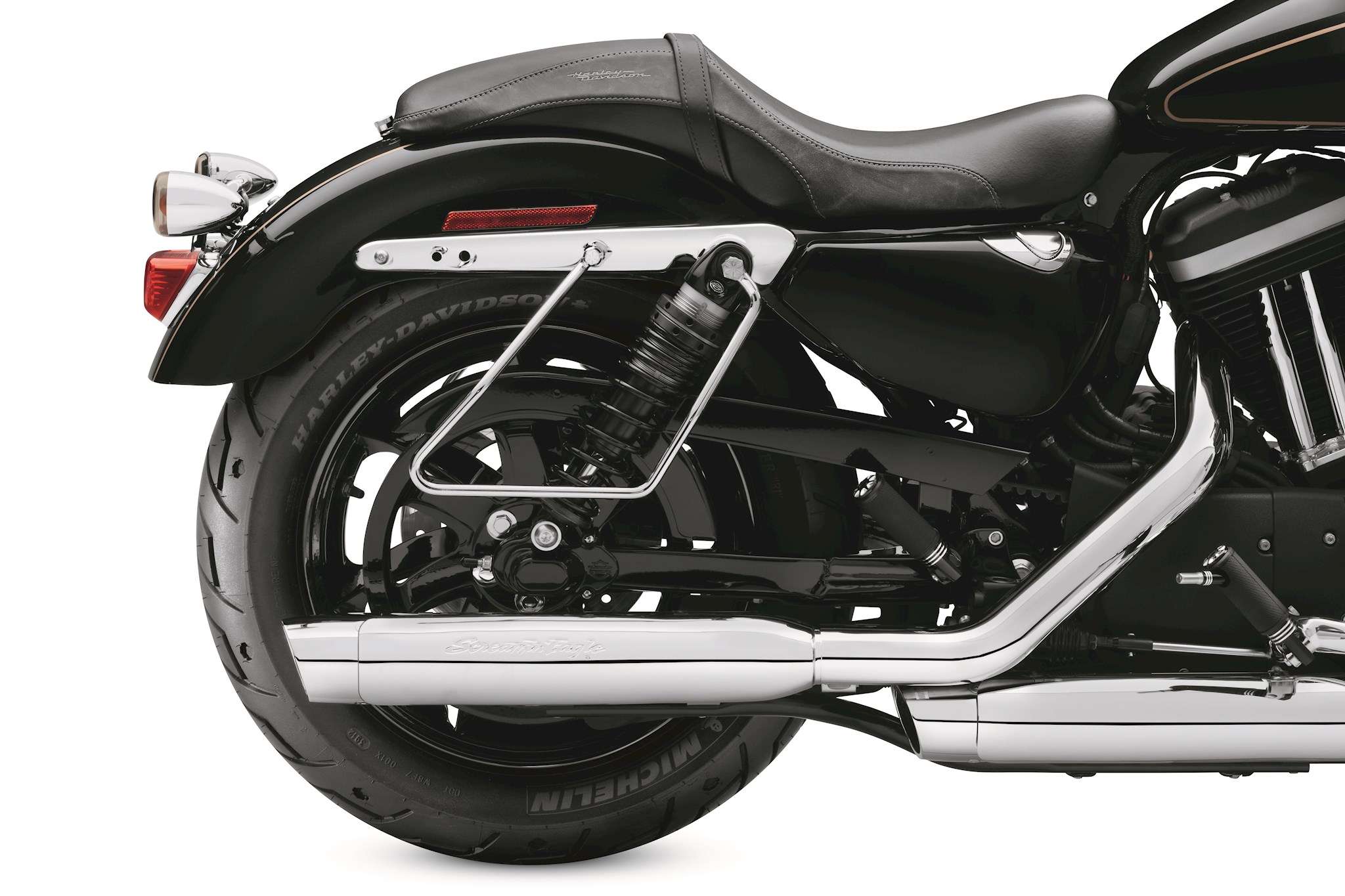 Keep your throw-over style saddlebags away from the wheel, swingarm and brake caliper. The elegant chrome-plated hoop attaches to the upper shock mount and fender strut, and can be installed on models equipped with rigid-mount sissy bar sideplates and uprights.