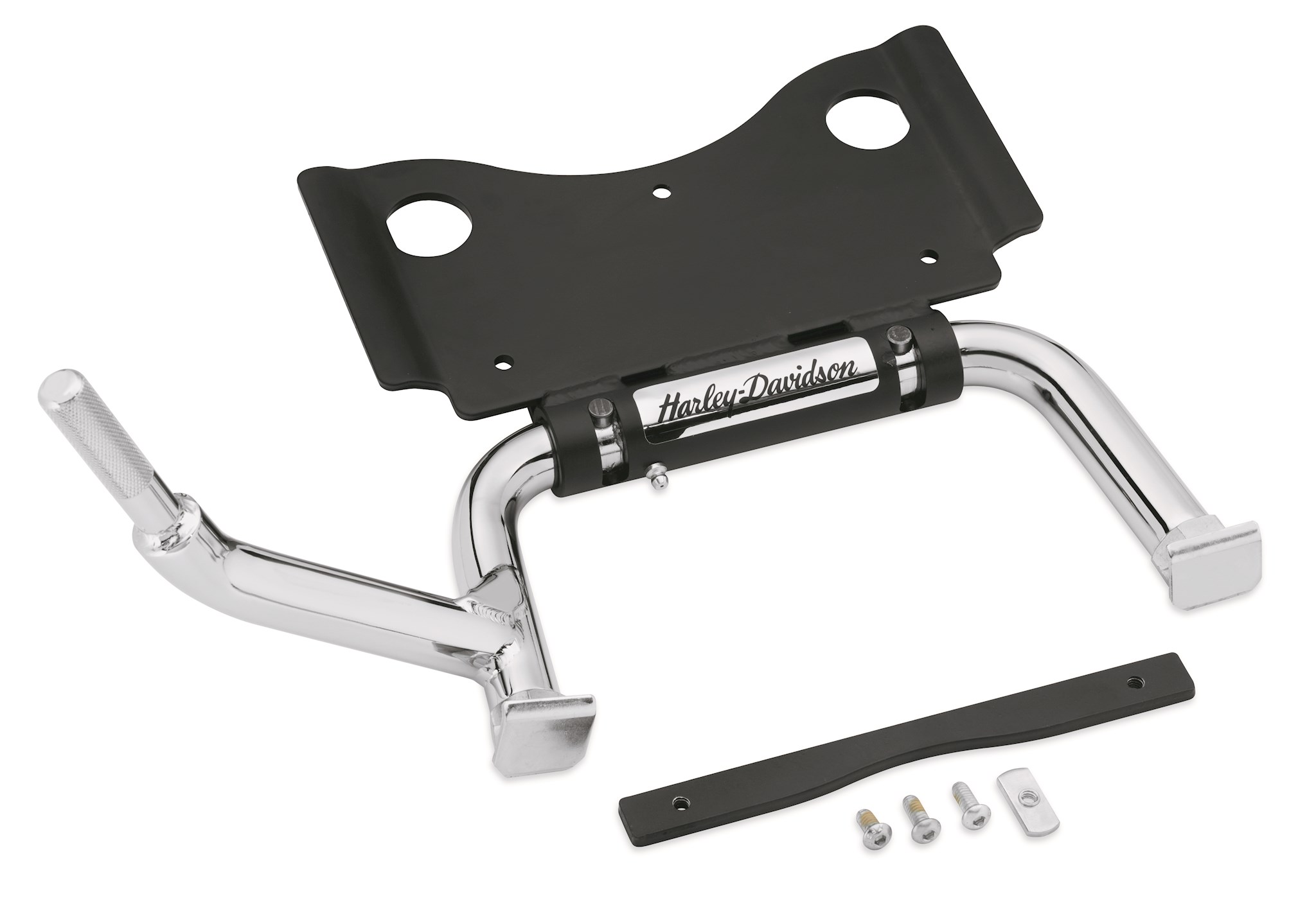 Lifting your bike upright and off the side stand is ideal for cleaning and servicing, and reduces the space required for parking - handy where space is at a premium in a crowded garage, a small parking spot, or at a ride-in bike show. The robust chrome Center Stand attaches directly to the frame and does not reduce the lean angle. Designed to work with all Original Equipment suspension configurations and with Profile® suspension lowering kits, the adjustable feet can be set to lift the rear tire clear of the pavement, or to keep the rear tire on the ground for reduced lifting effort. The lifting lever is inconspicuously tucked away, and fits with all Harley-Davidson® Original Equipment and accessory footboards. Kit includes chrome stand, black mounting brackets, and all necessary installation hardware.