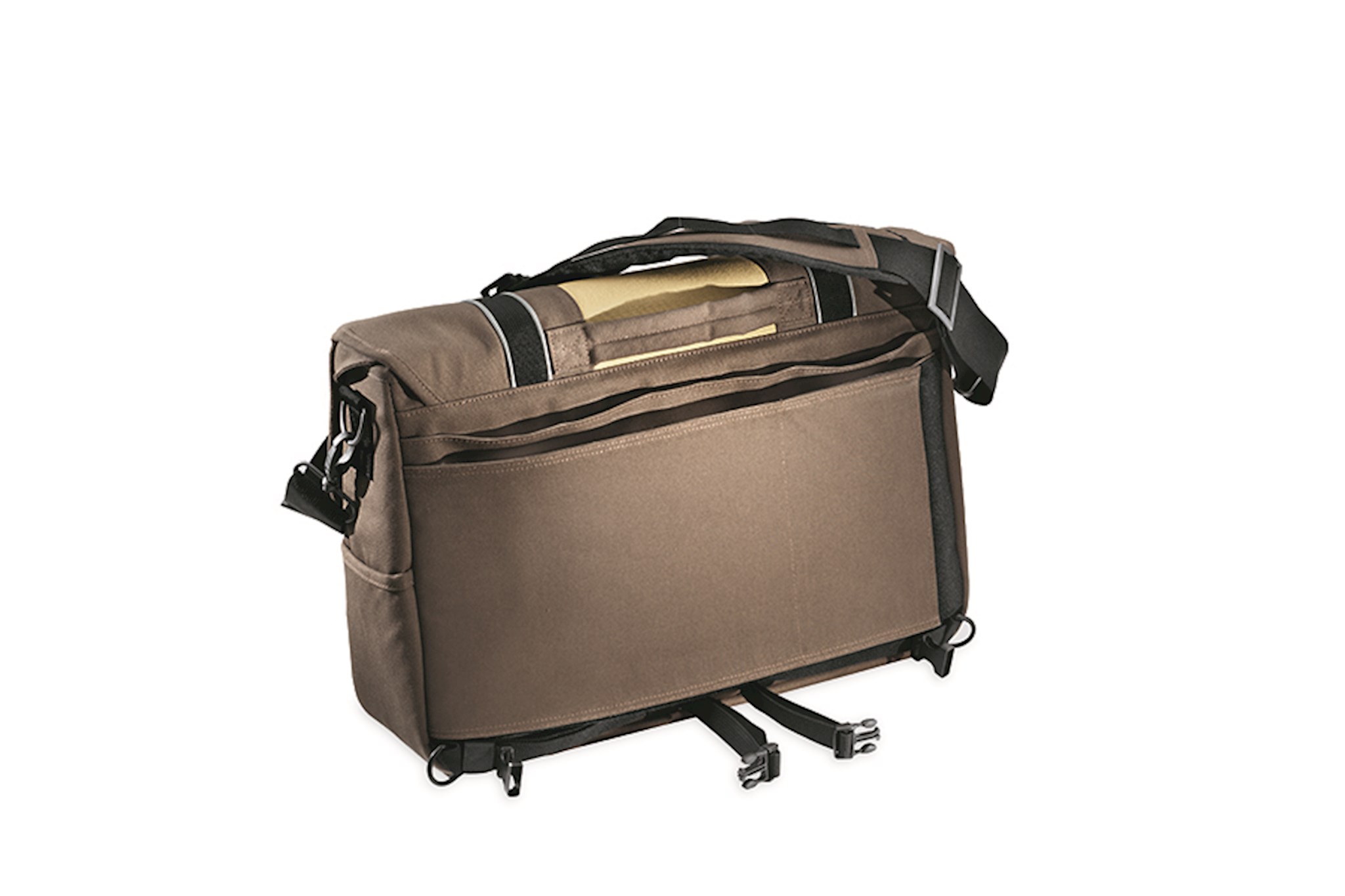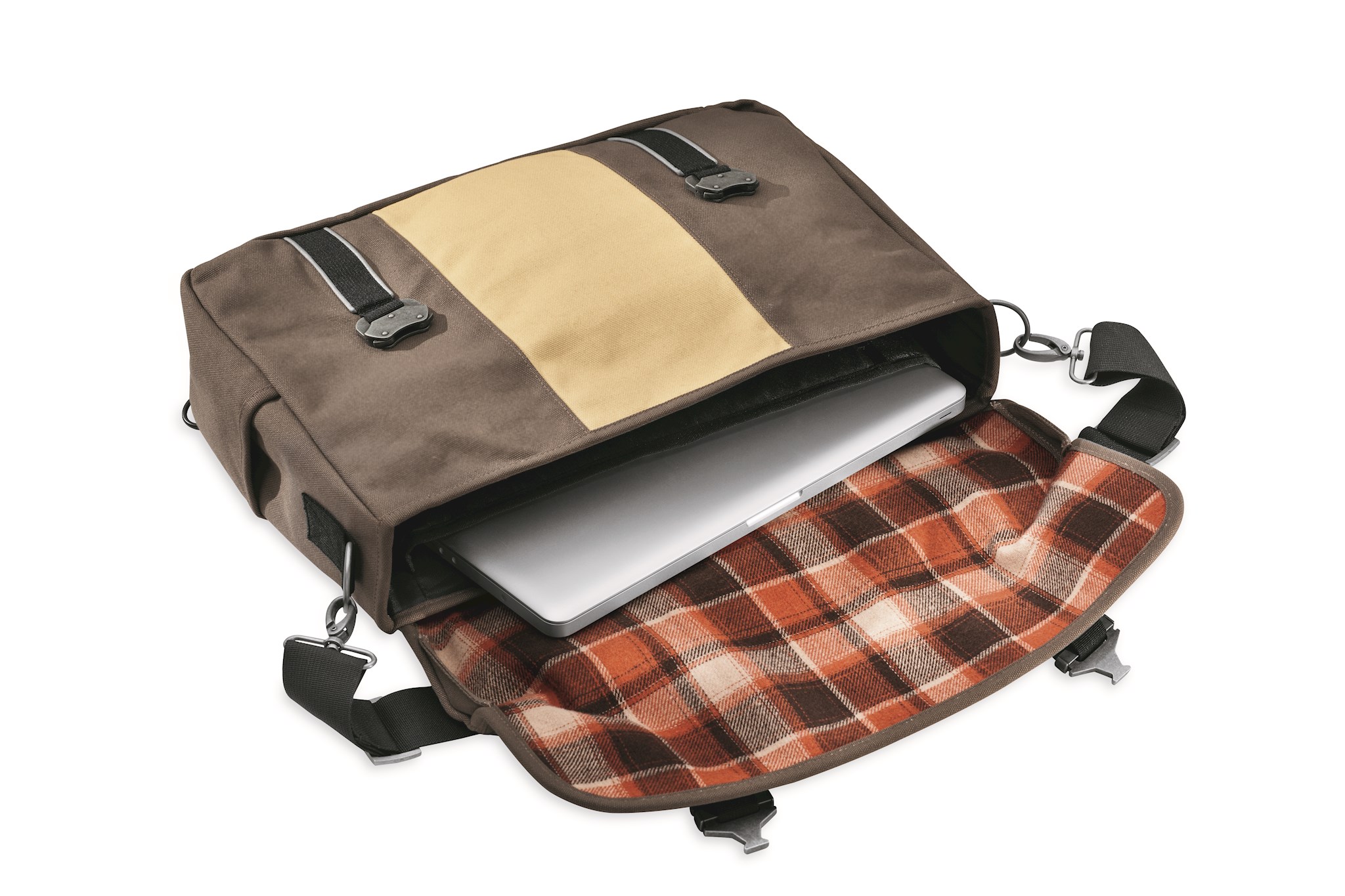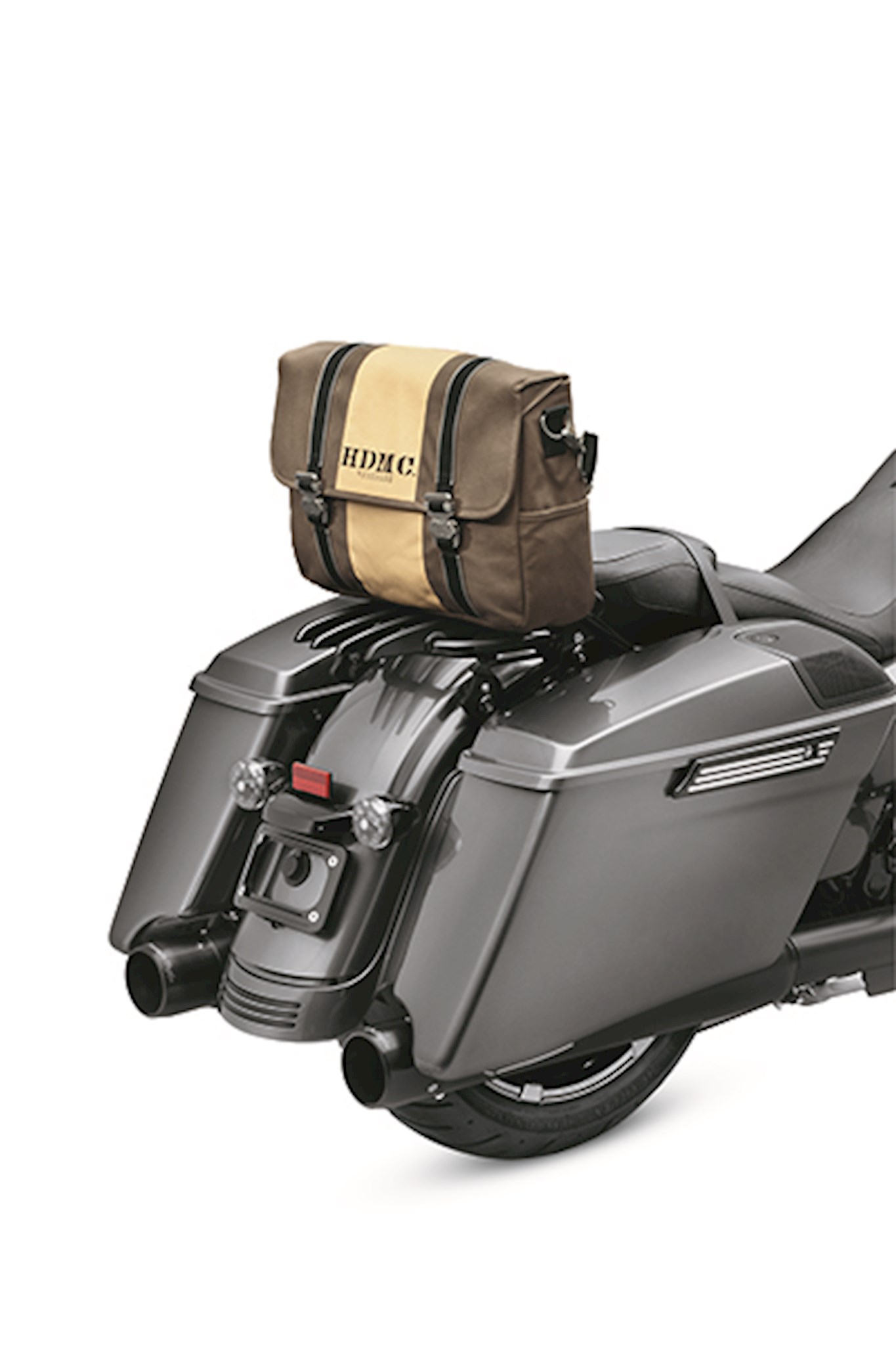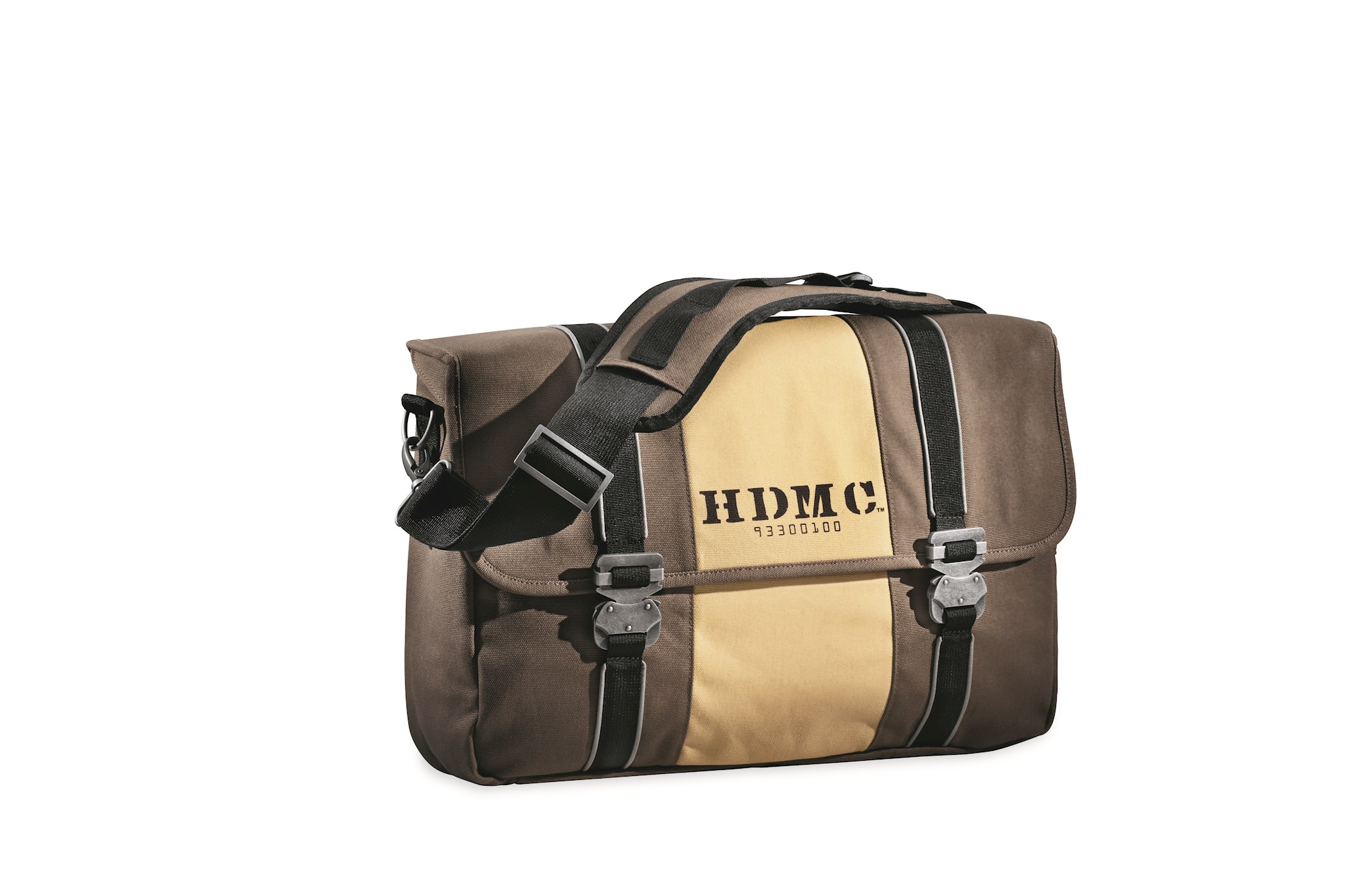 Take to the road in style. This bag is crafted to serve as a practical commuter and as a stylish day bag - both on and off the bike. The soft and flexible sling bag features a padded shoulder strap with a cross-chest stabilizer strap that securely holds the bag in place across your back. Or you can secure the bag to the sissy bar with the wide adjustable hook-and-loop flap and quick release tabs. The genuine canvas bag is trimmed with contrasting web straps, distressed metal buckles and a comfortable carrying handle. The exterior of the bag features a newspaper pocket, a side pocket, and bold stenciled HDMC graphics. Behind the wide flap, the water-resistant inner cavity features a padded laptop compartment that fits most 17" screens, a padded tablet pocket, and separate pockets to store cell phones, pens, glasses and more. The bag also includes a rubberized port for easy headphone connection. Dimensions: 19.0" W x 3.5" D x 13.5" T.