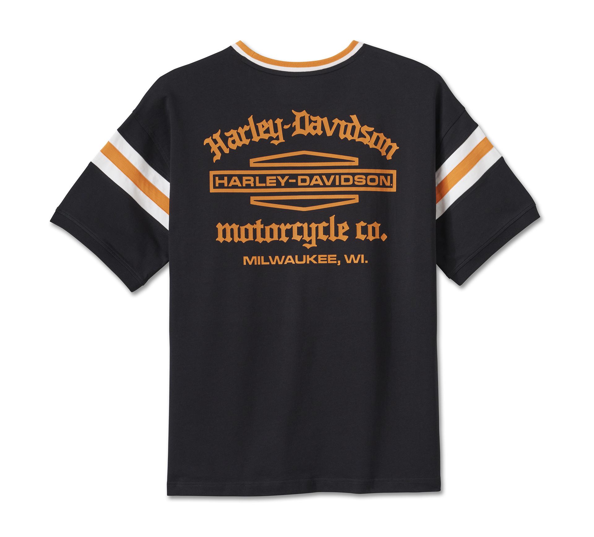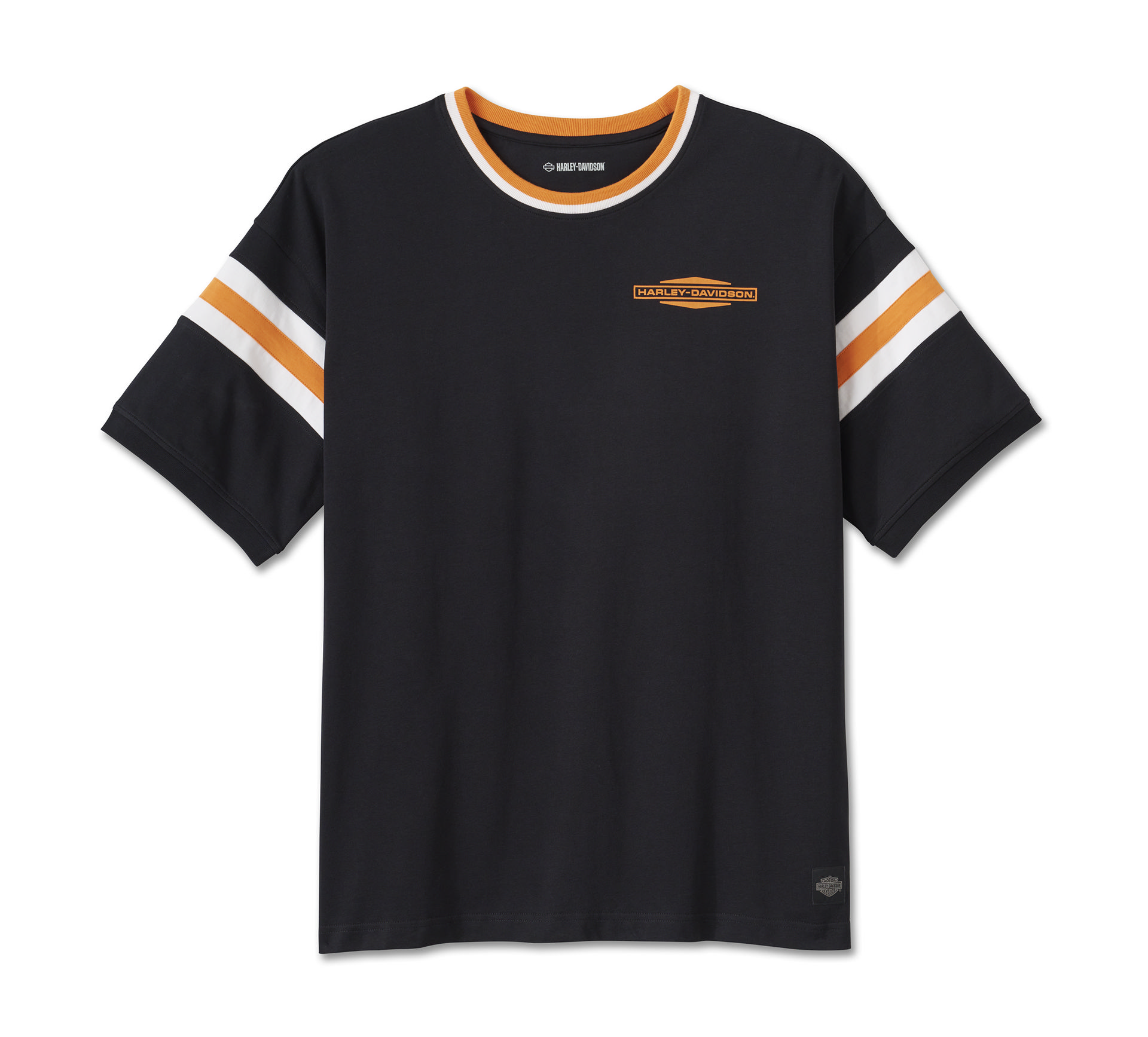 Sportieve stijl krijgt een H-D upgrade op ons Play On Drop Shoulder T-shirt. Dit T-shirt voor heren is gemaakt van ademende katoenen jersey en heeft een relaxte pasvorm. Het heeft contrasterende strepen op de mouwen en hals voor een gedurfdere look die goed past bij onze seizoensgraphics. Een beetje Harley-geschiedenis - het gestapelde Bar & Shield-logo hier debuteerde in 1963 toen het horizontaal werd verlengd om beter op de benzinetanks van onze motorfietsen te passen.