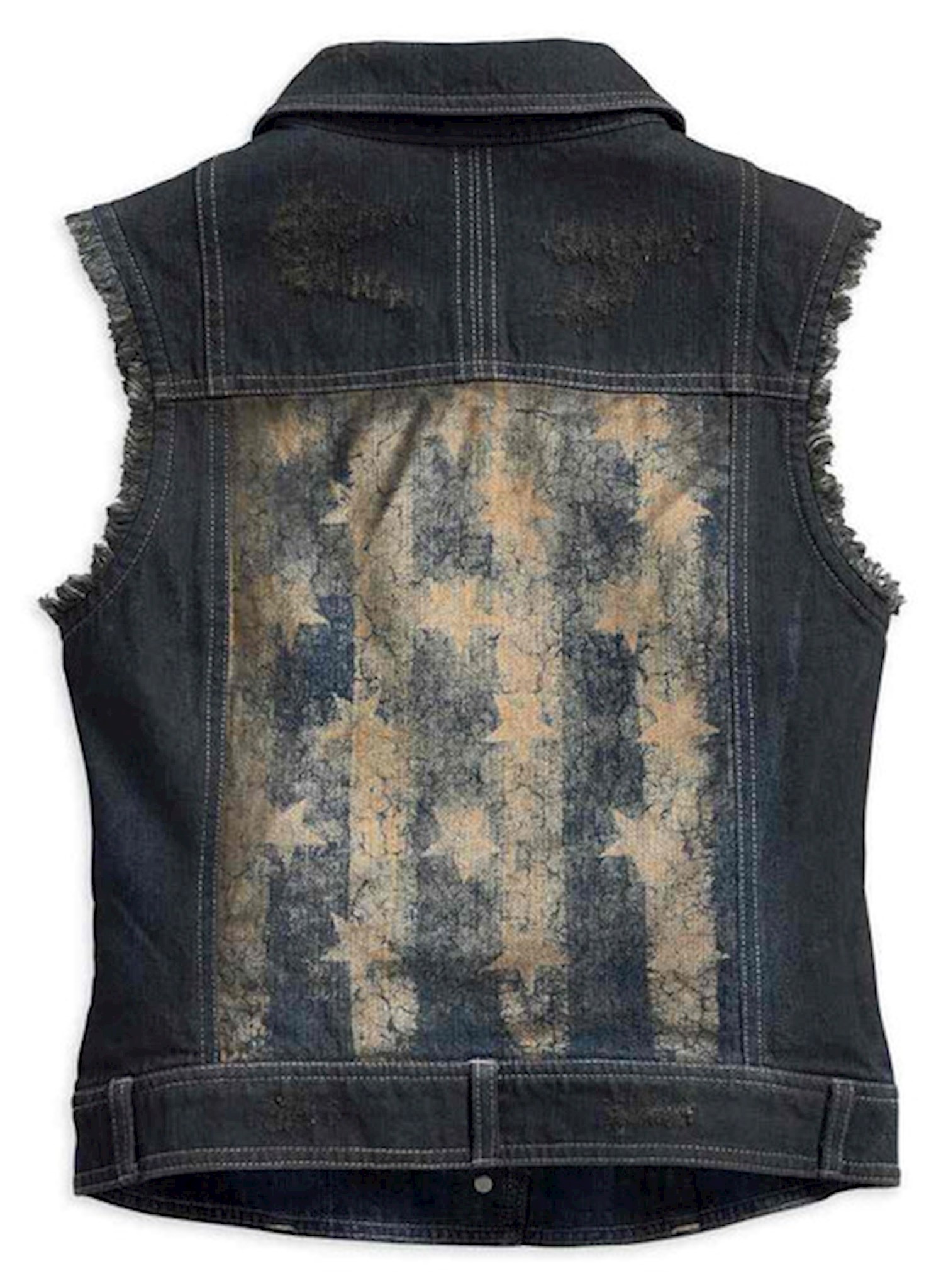 Harley-Davidson® Women's Americana Denim Vest, 96152-17VW. Made of 100% cotton denim with black spray effect and distressing. Button front. Two button flap chest pockets. Belt loops. Frayed armholes. Button epaulets. Embroidered graphics on left chest. Distressed printed graphics on back. The patriotic Americana Denim Vest adds some spark to the annual Independence Collection.
