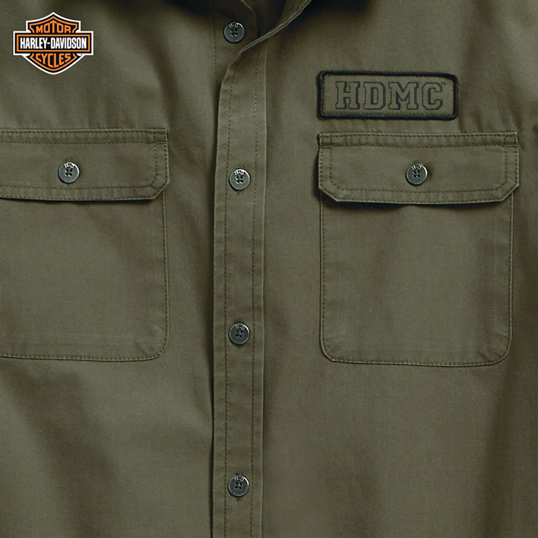 Harley-Davidson® Men's HDMC® Canvas Slim Fit Long Sleeve Woven Shirt, 96166-18VM. Made from 100% cotton canvas with an enzyme wash. Button front and cuffs. Two button flap chest pockets. Button epaulets. Woven label on placket hem. Printed patch on left chest. Slim Fit—fits closer to the body, size up for a more relaxed fit. The rugged HDMC Canvas Slim Fit Shirt is a versatile look that's at home with cargoes or jeans. Enzyme wash gives it lived-in style while button epaulets add structure. This men's long sleeve shirt features a Slim Fit that is narrower throughout.