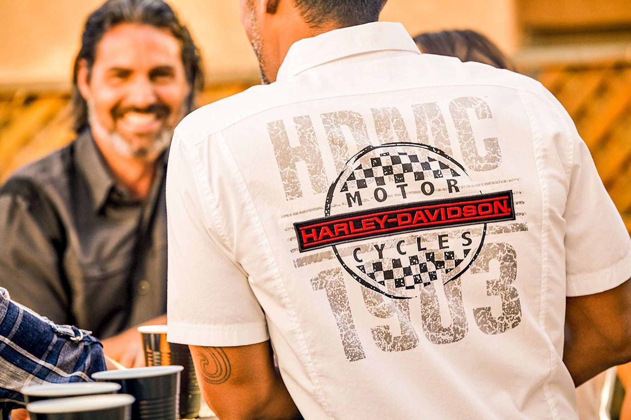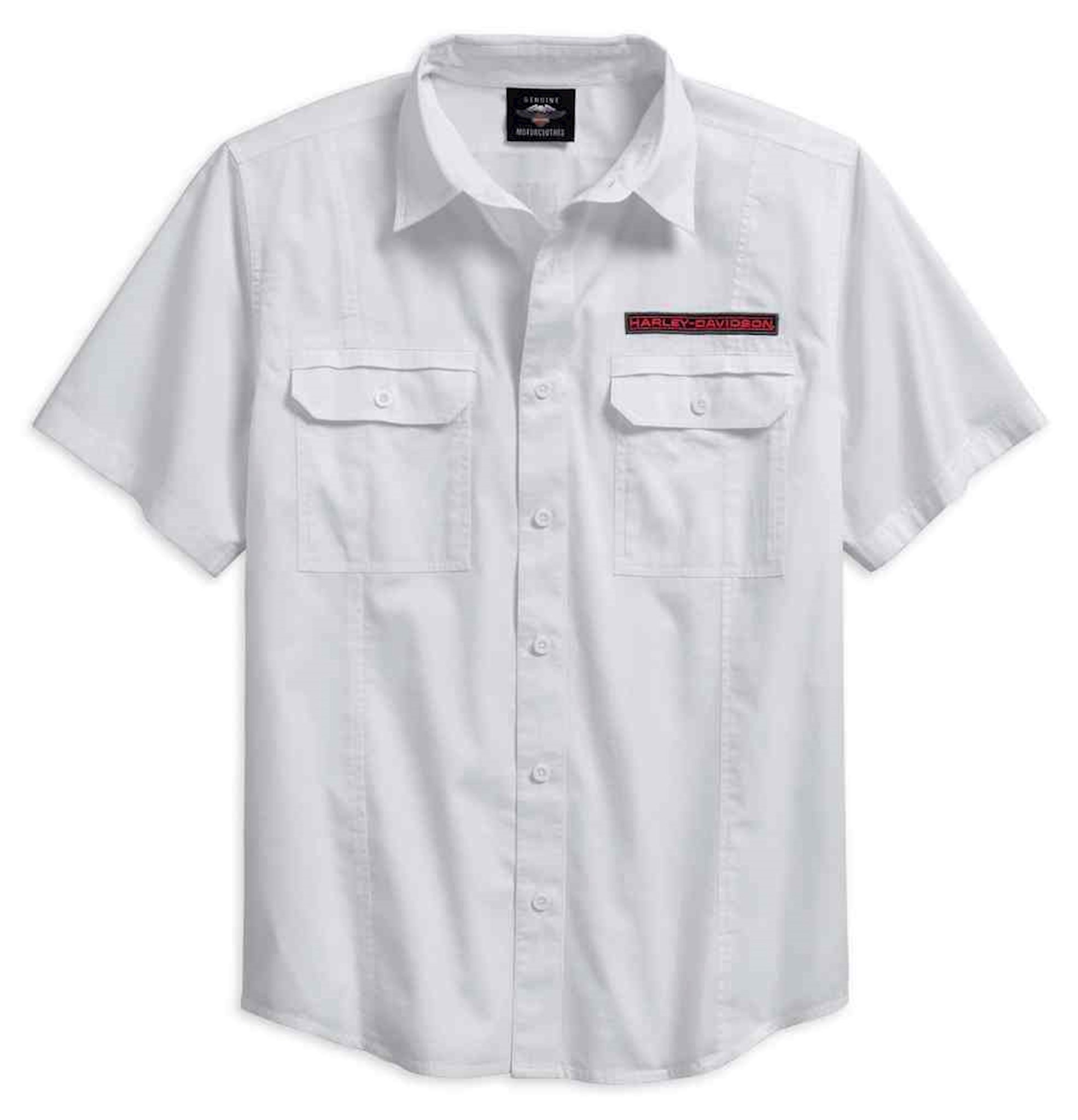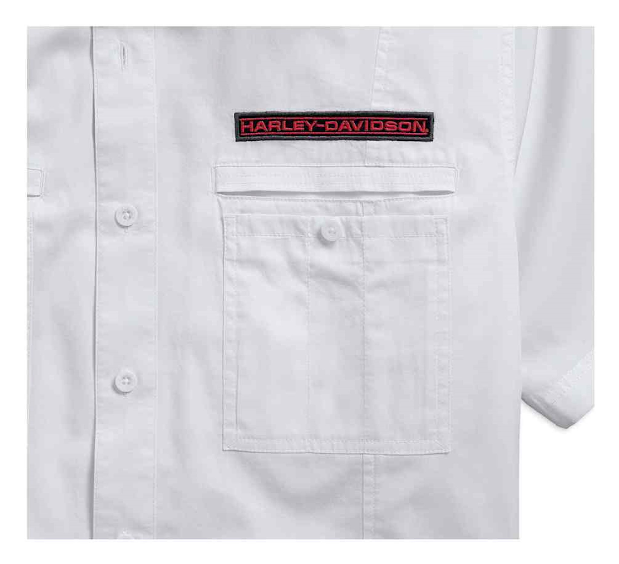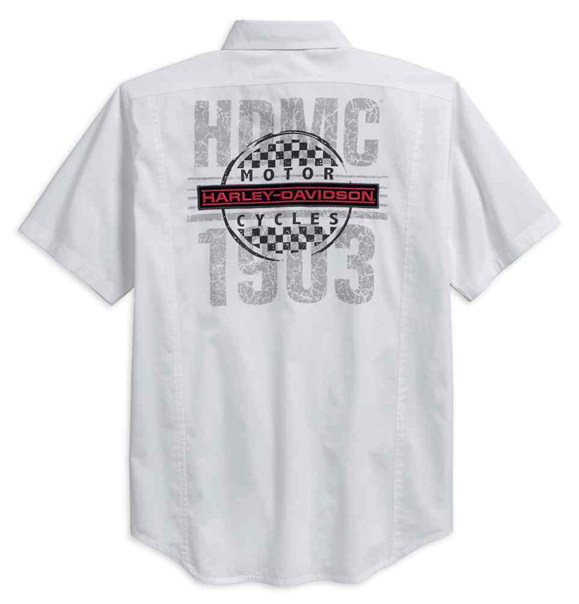 Harley-Davidson® Men's Checkerboard Graphic Shirt, 96194-18VM. Flip it over for impossible-to-miss distressed graphics and appliqué. Note the checkered pattern nodding back to our race heritage. Made from 100% cotton twill that is washed for softness. Button front and snap-down collar. Two button flap chest pockets with convertible flaps that can be tucked in to reveal additional slit chest pockets. Embroidered appliqué graphics on left chest. Distressed printed and embroidered appliqué graphics on back.