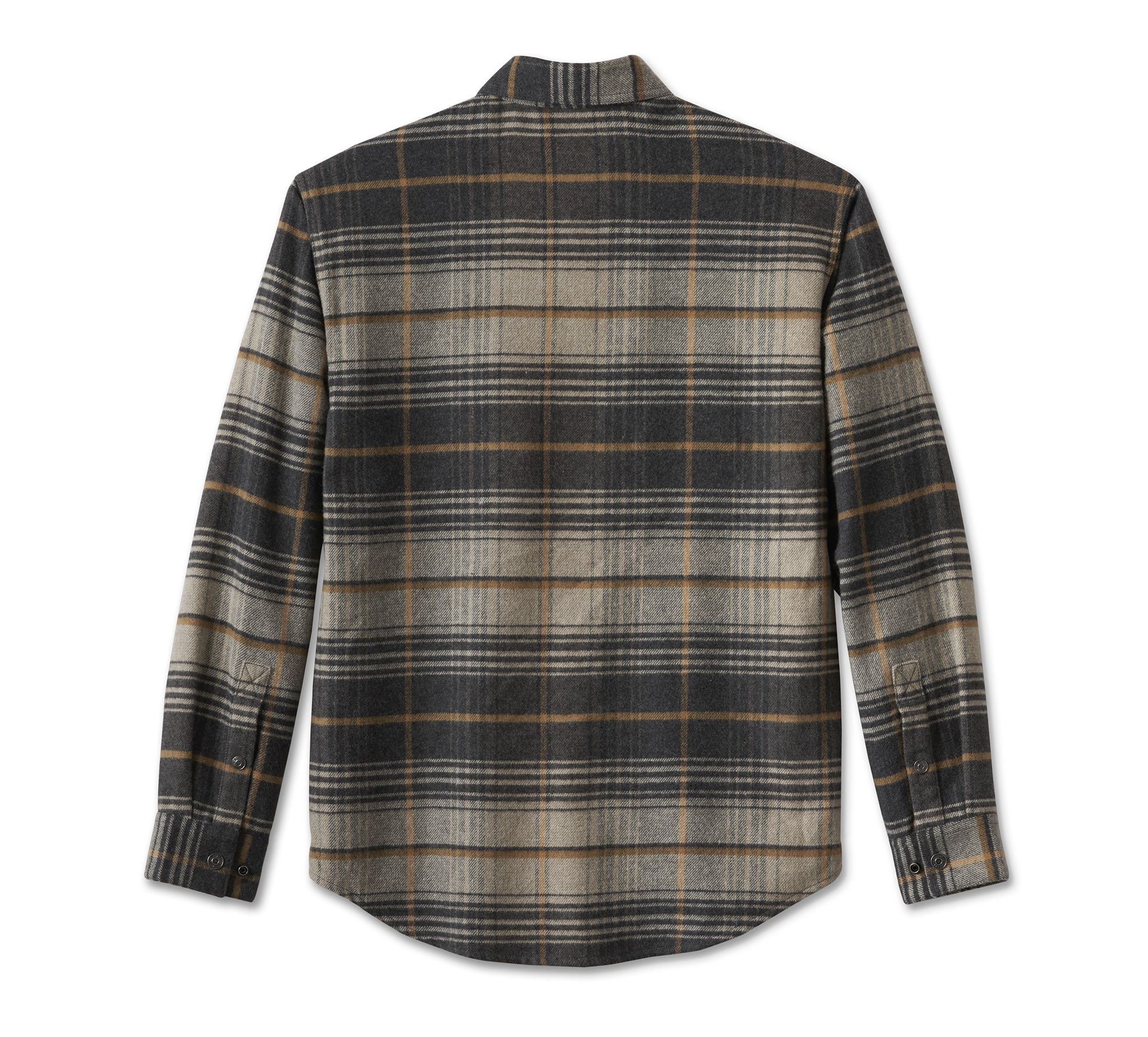 70% cotton, 30% wool heavyweight twill. Snap front and sleeves. Adjustable snap cuffs. Snap flap chest pocket.